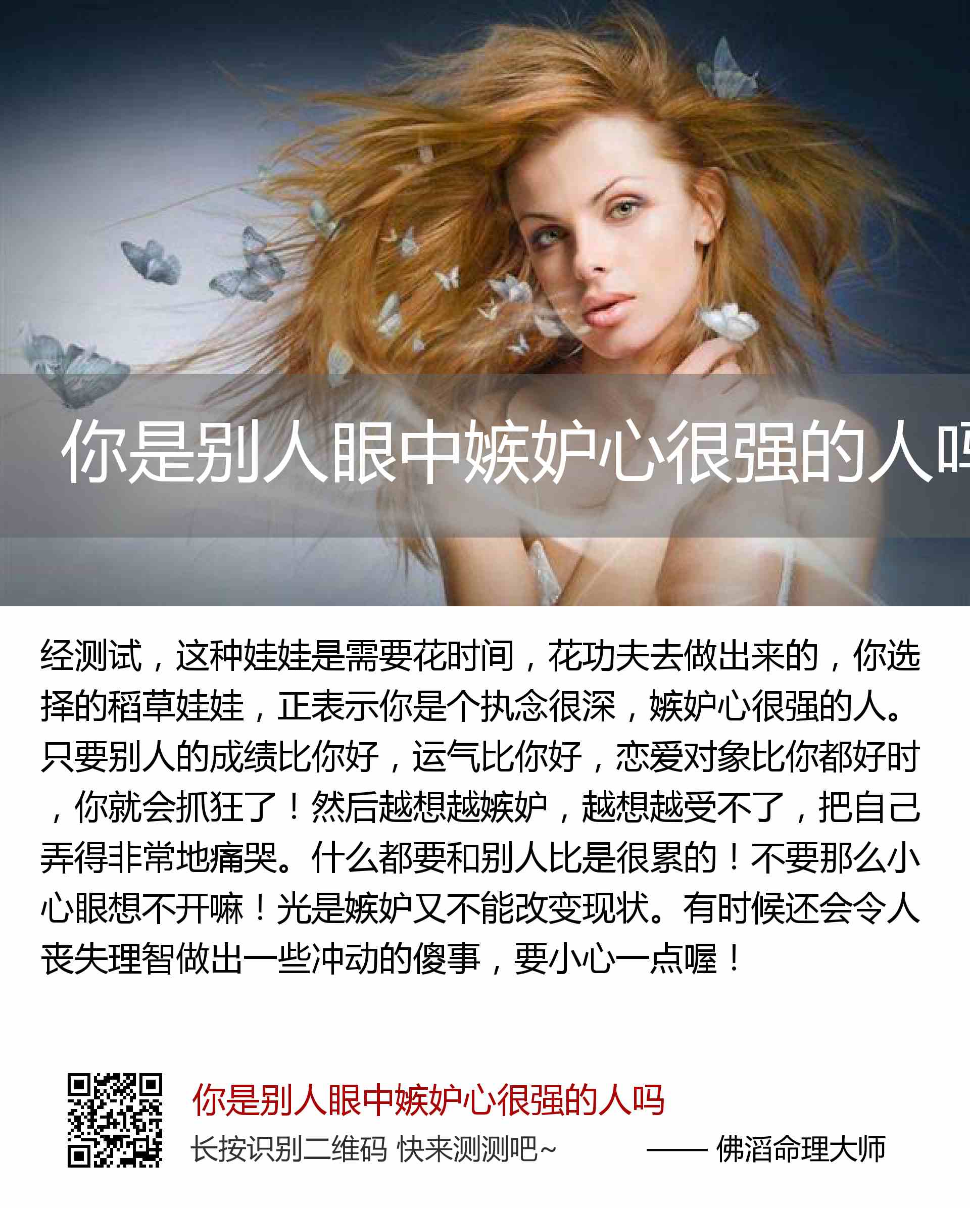 这种娃娃是需要花时间,花功夫去做出来的,你选择的稻草娃娃,正表示你是个执念很深,嫉妒心很强的人。