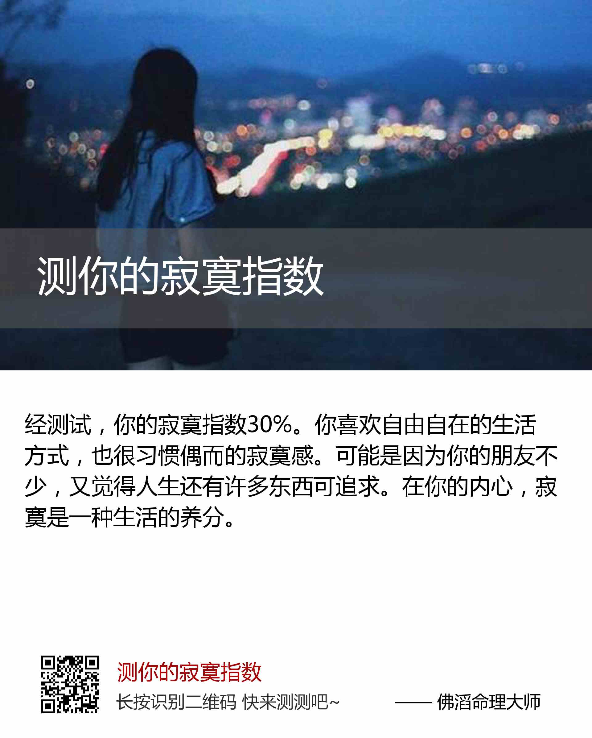 你喜欢自由自在的生活方式,也很习惯偶而的寂寞感。可能是因为你的朋友不少,又觉得人生还有许多东西可追求。在你的内心,寂寞是一种生活的养分。