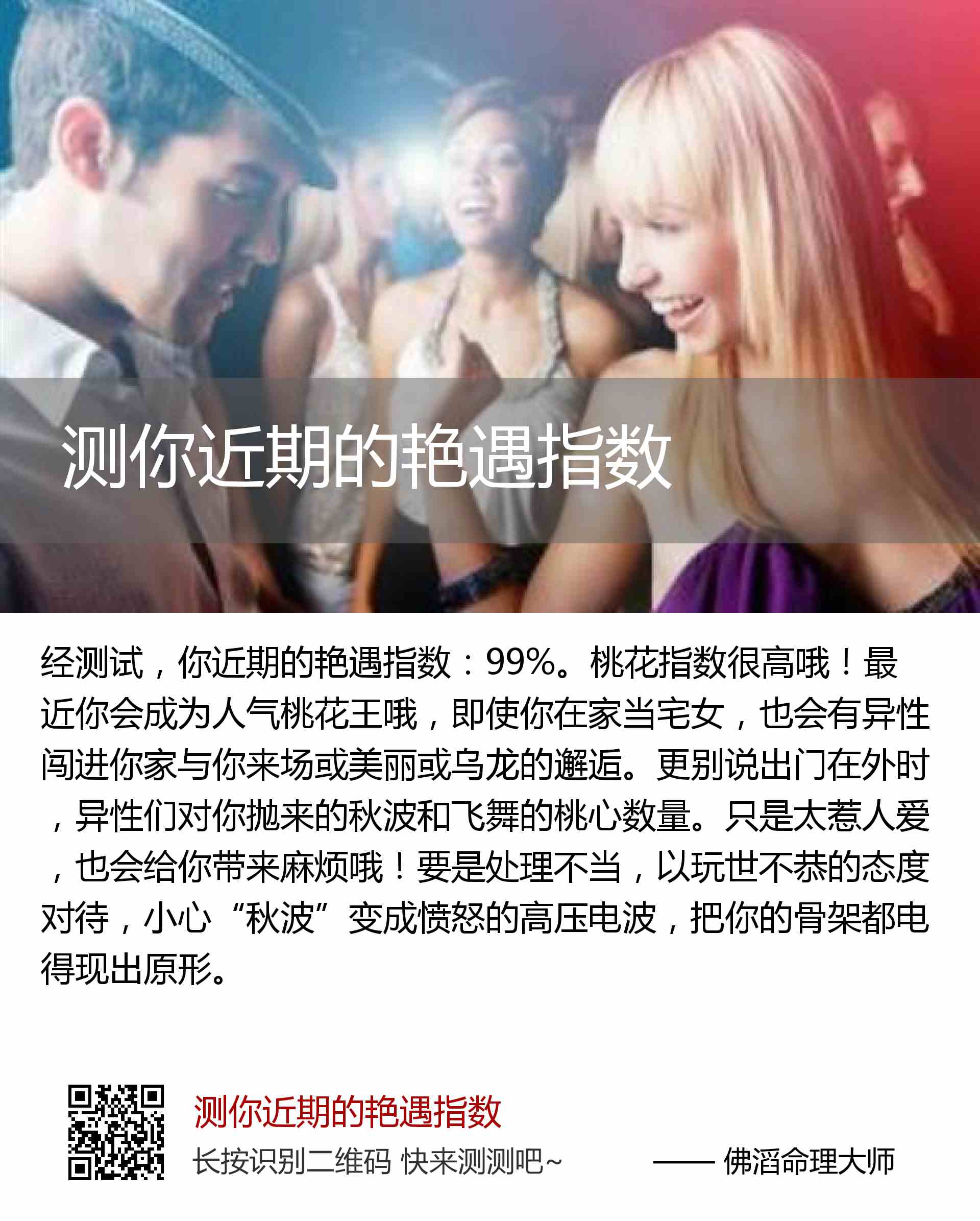桃花指数很高哦!最近你会成为人气桃花王哦,即使你在家当宅女,也会有异性闯进你家与你来场或美丽或乌龙的邂逅。更别说出门在外时,异性们对你抛来的秋波和飞舞的桃心数量。只是太惹人爱,也会给你带来麻烦哦!要是处理不当,以玩世不恭的态度对待,小心“秋波”变成愤怒的高压电波,把你的骨架都电得现出原形。