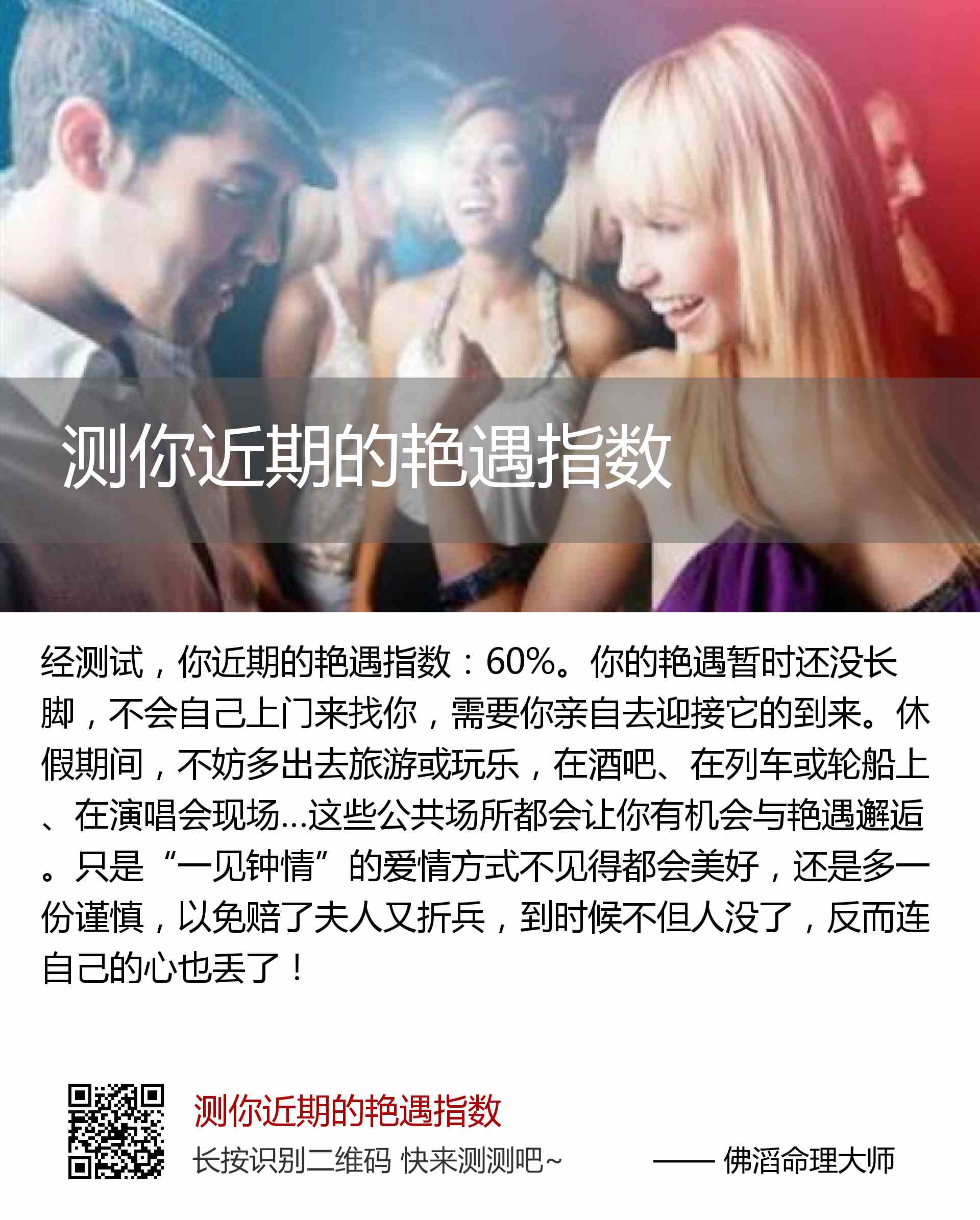 你的艳遇暂时还没长脚,不会自己上门来找你,需要你亲自去迎接它的到来。休假期间,不妨多出去旅游或玩乐,在酒吧、在列车或轮船上、在演唱会现场…这些公共场所都会让你有机会与艳遇邂逅。只是“一见钟情”的爱情方式不见得都会美好,还是多一份谨慎,以免赔了夫人又折兵,到时候不但人没了,反而连自己的心也丢了!
