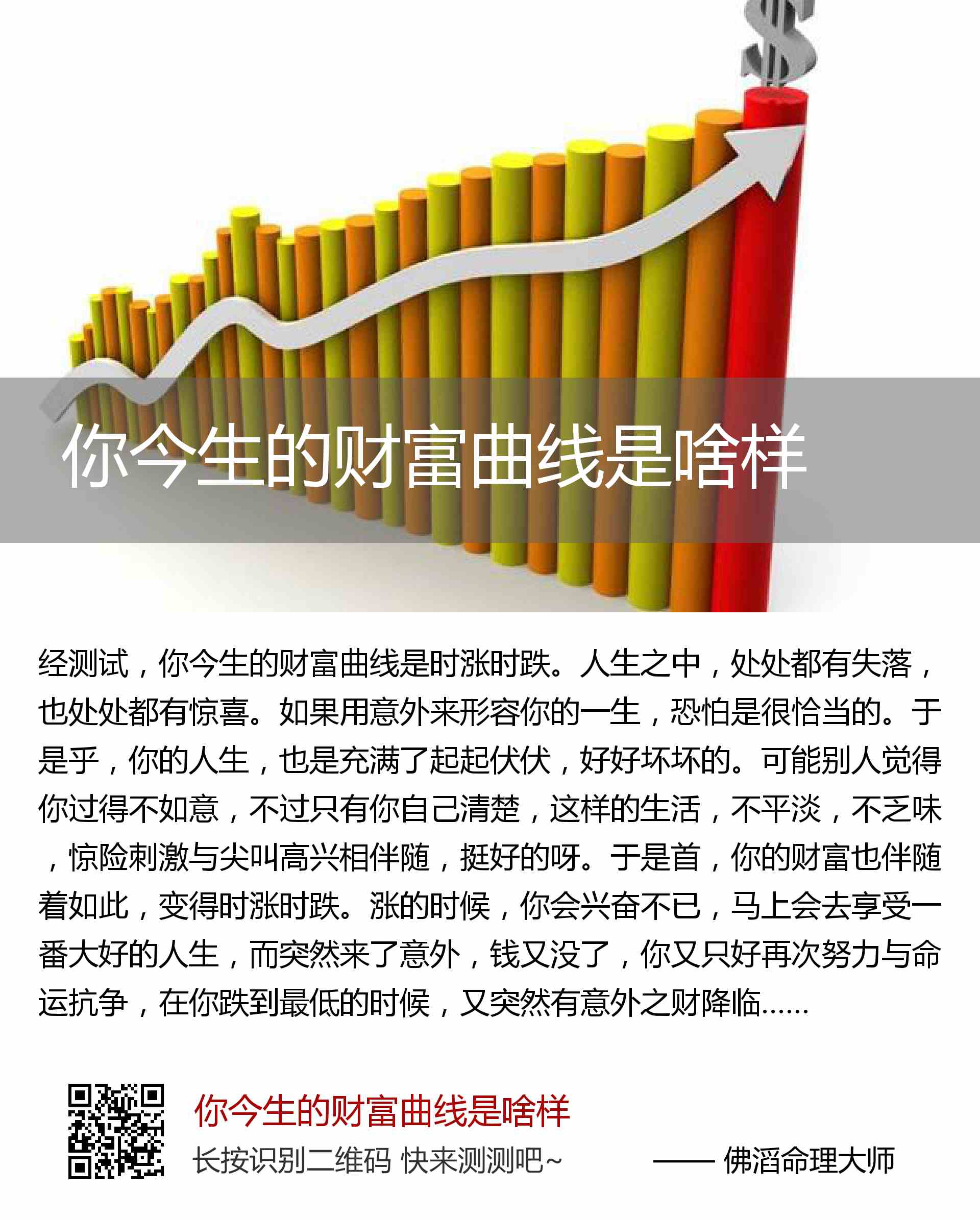人生之中,处处都有失落,也处处都有惊喜。如果用意外来形容你的一生,恐怕是很恰当的。于是乎,你的人生,也是充满了起起伏伏,好好坏坏的。可能别人觉得你过得不如意,不过只有你自己清楚,这样的生活,不平淡,不乏味,惊险刺激与尖叫高兴相伴随,挺好的呀。于是首,你的财富也伴随着如此,变得时涨时跌。涨的时候,你会兴奋不已,马上会去享受一番大好的人生,而突然来了意外,钱又没了,你又只好再次努力与命运抗争,在你跌到最低的时候,又突然有意外之财降临……