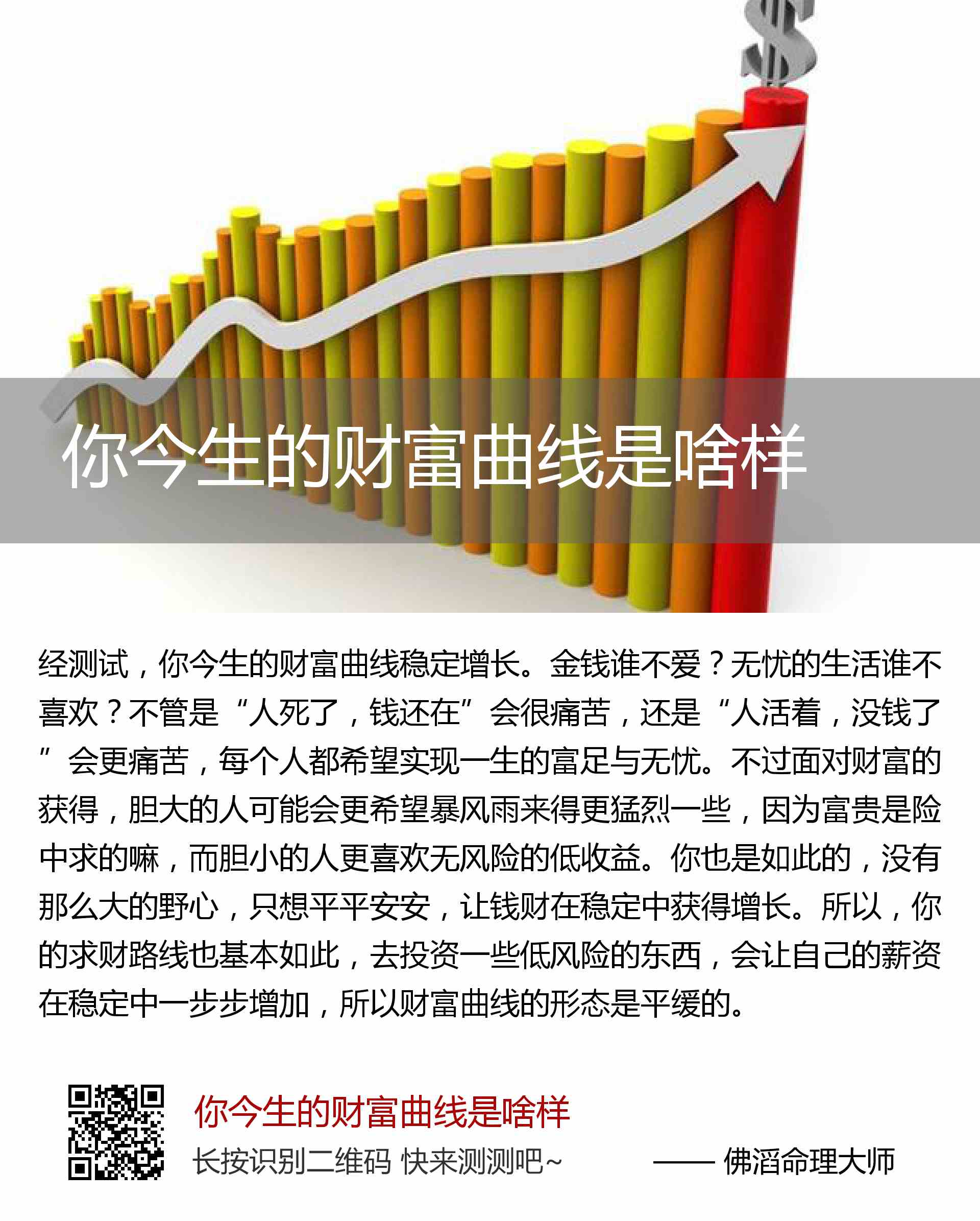 金钱谁不爱?无忧的生活谁不喜欢?不管是“人死了,钱还在”会很痛苦,还是“人活着,没钱了”会更痛苦,每个人都希望实现一生的富足与无忧。不过面对财富的获得,胆大的人可能会更希望暴风雨来得更猛烈一些,因为富贵是险中求的嘛,而胆小的人更喜欢无风险的低收益。你也是如此的,没有那么大的野心,只想平平安安,让钱财在稳定中获得增长。所以,你的求财路线也基本如此,去投资一些低风险的东西,会让自己的薪资在稳定中一步步增加,所以财富曲线的形态是平缓的。
