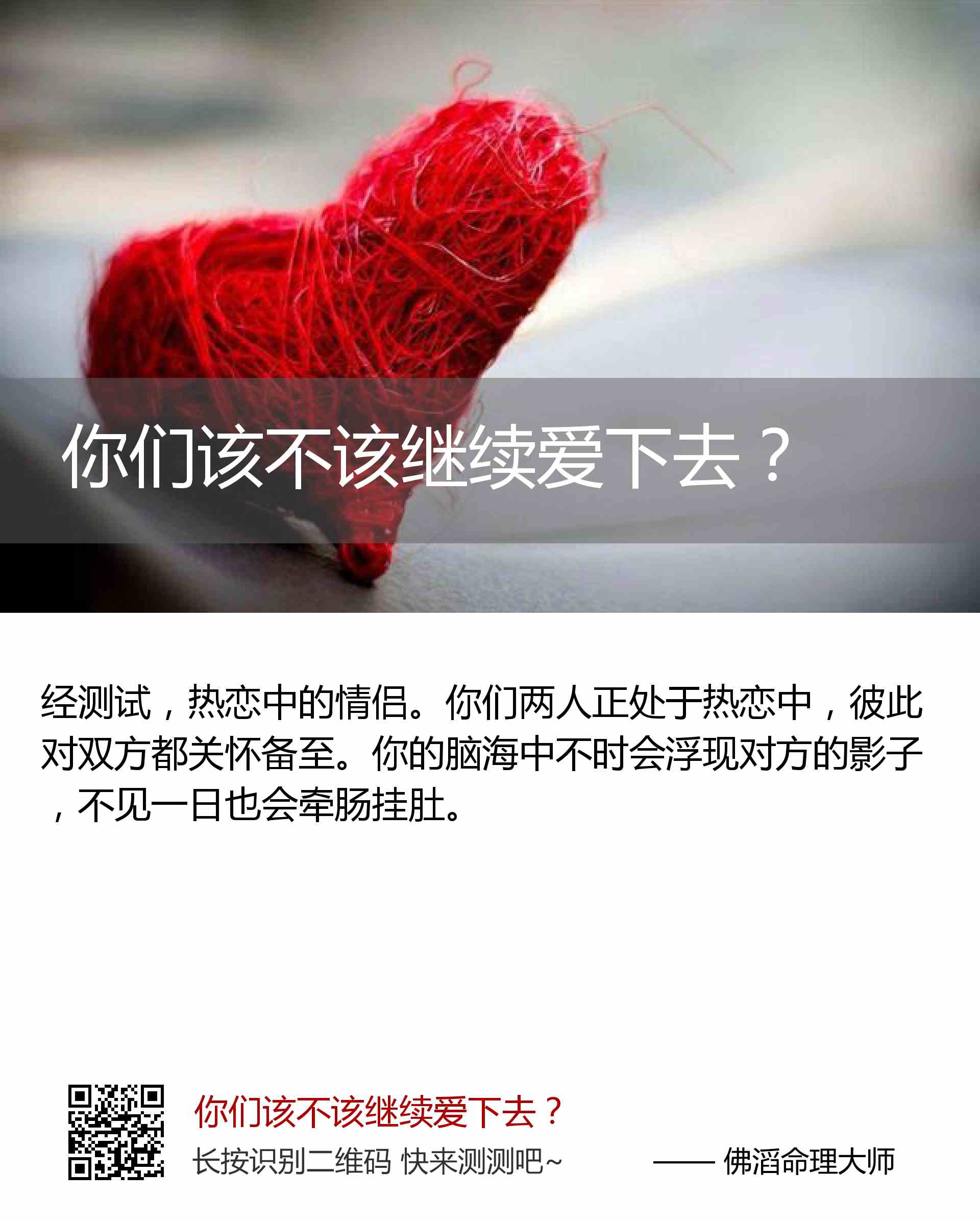 你们两人正处于热恋中,彼此对双方都关怀备至。你的脑海中不时会浮现对方的影子,不见一日也会牵肠挂肚。
