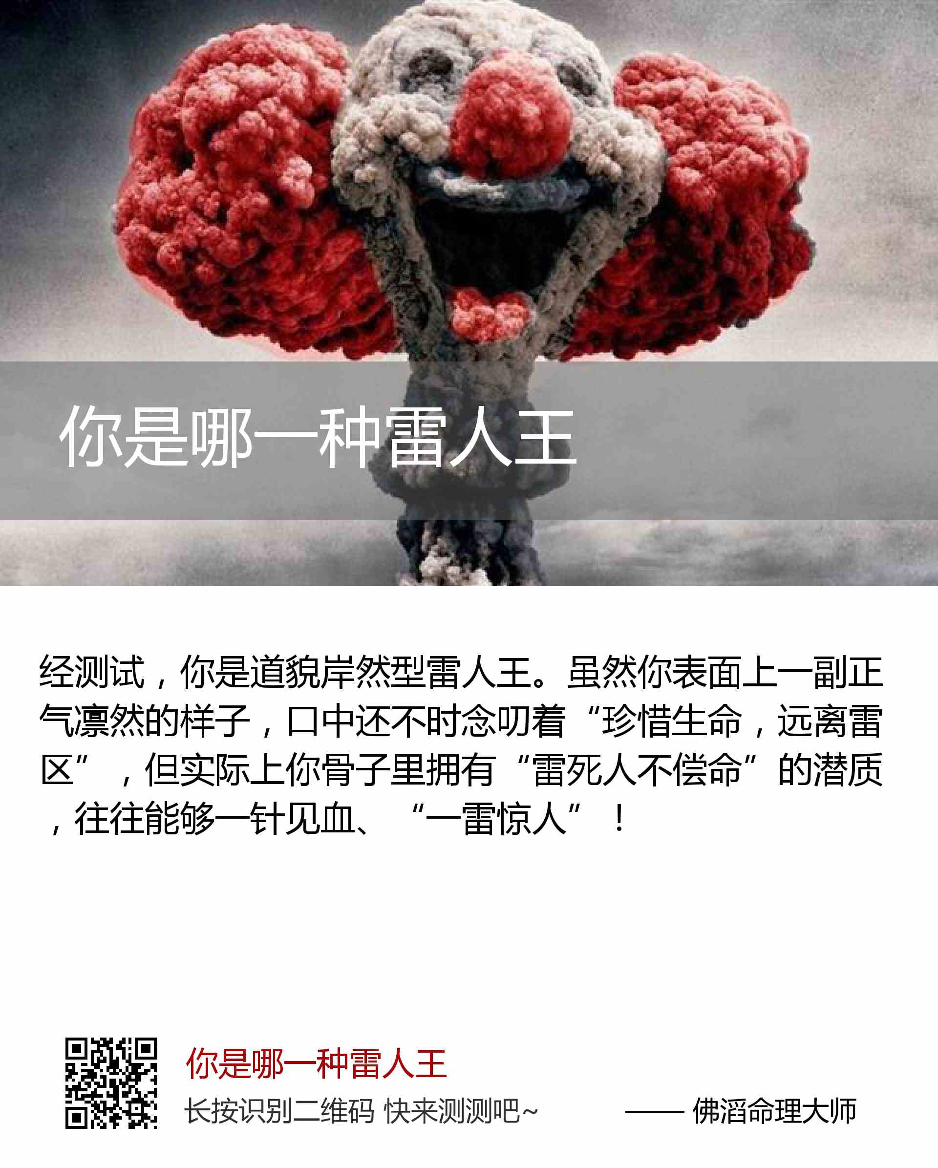 虽然你表面上一副正气凛然的样子,口中还不时念叨着“珍惜生命,远离雷区”,但实际上你骨子里拥有“雷死人不偿命”的潜质,往往能够一针见血、“一雷惊人”!