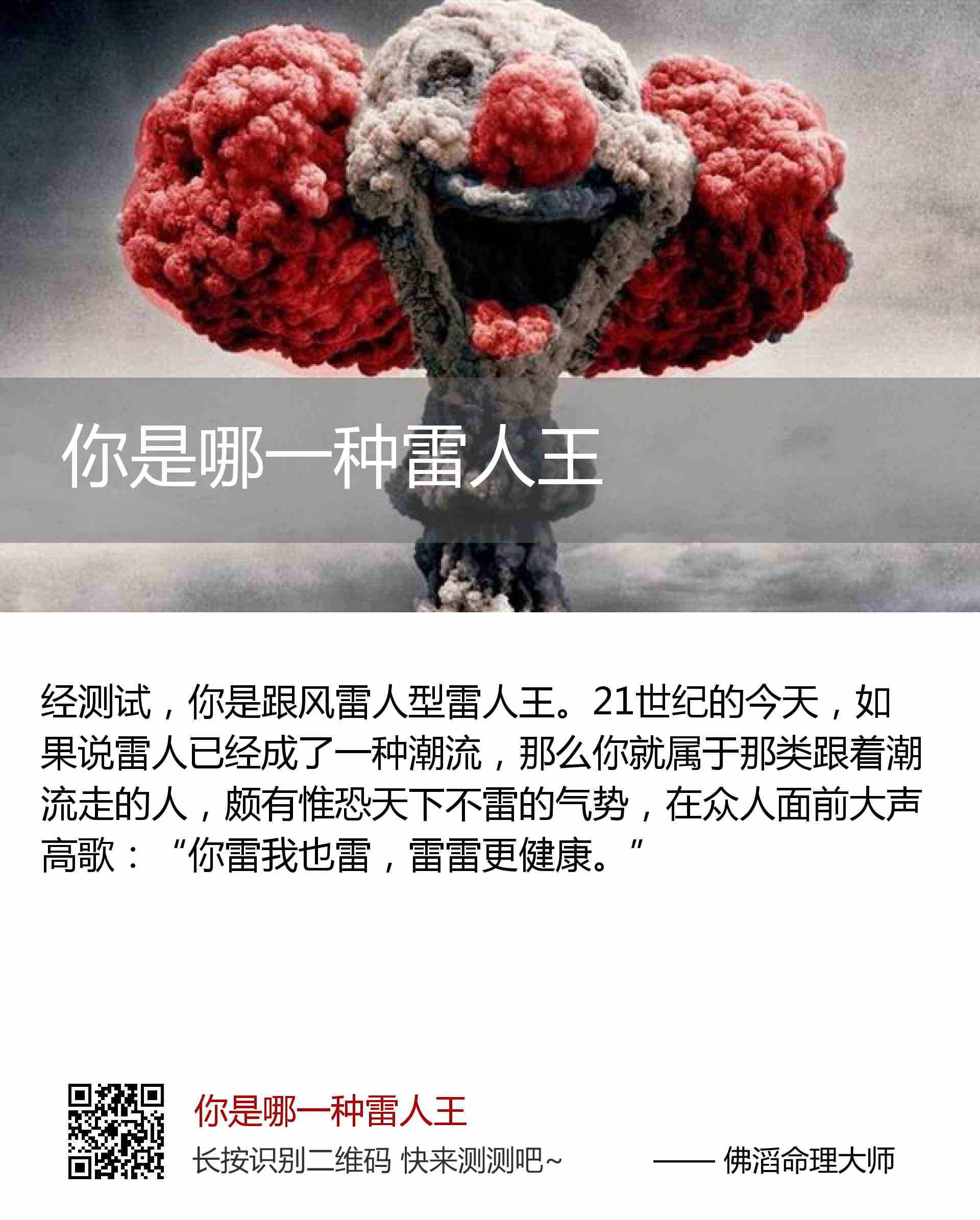 21世纪的今天,如果说雷人已经成了一种潮流,那么你就属于那类跟着潮流走的人,颇有惟恐天下不雷的气势,在众人面前大声高歌:“你雷我也雷,雷雷更健康。”