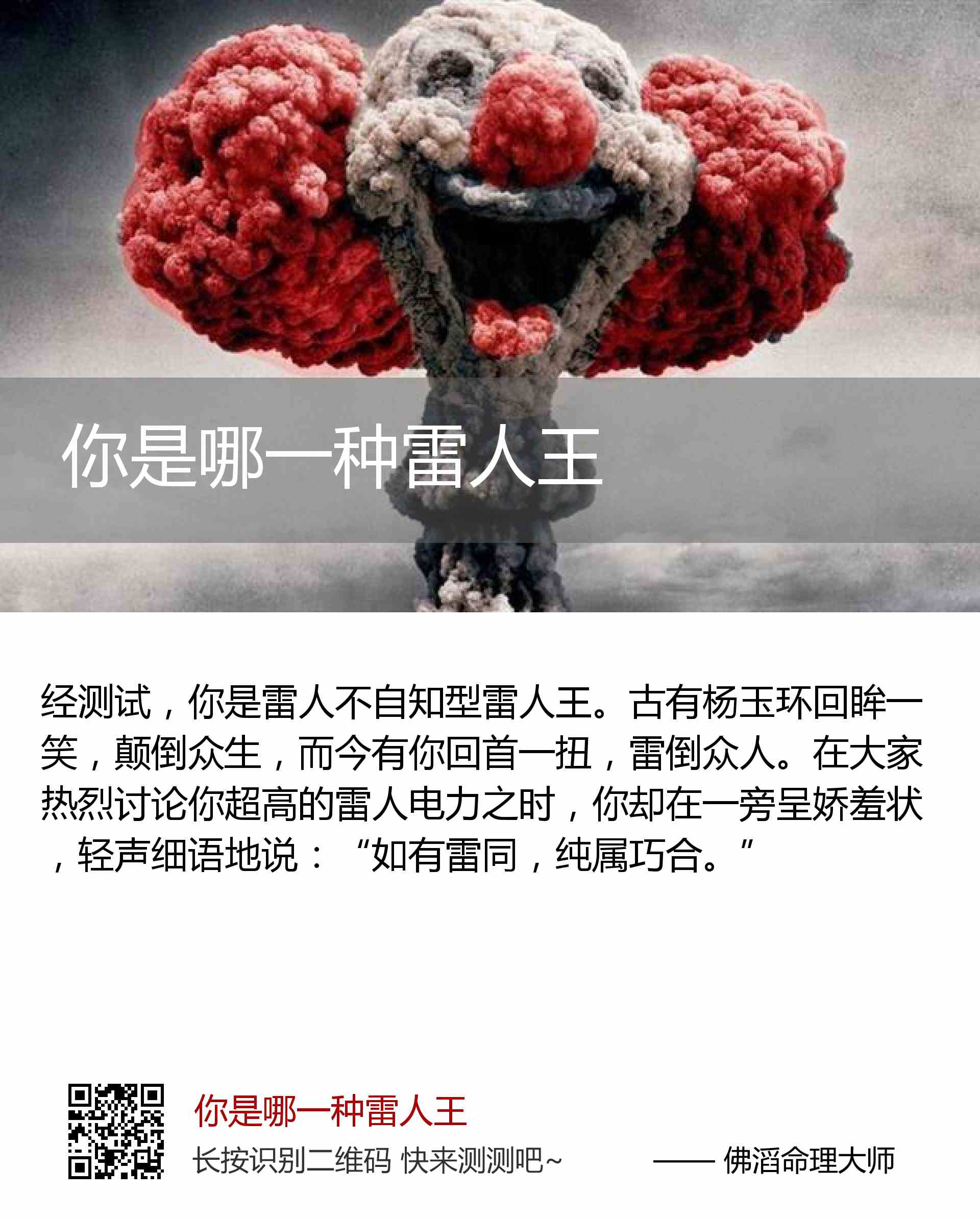古有杨玉环回眸一笑,颠倒众生,而今有你回首一扭,雷倒众人。在大家热烈讨论你超高的雷人电力之时,你却在一旁呈娇羞状,轻声细语地说:“如有雷同,纯属巧合。”