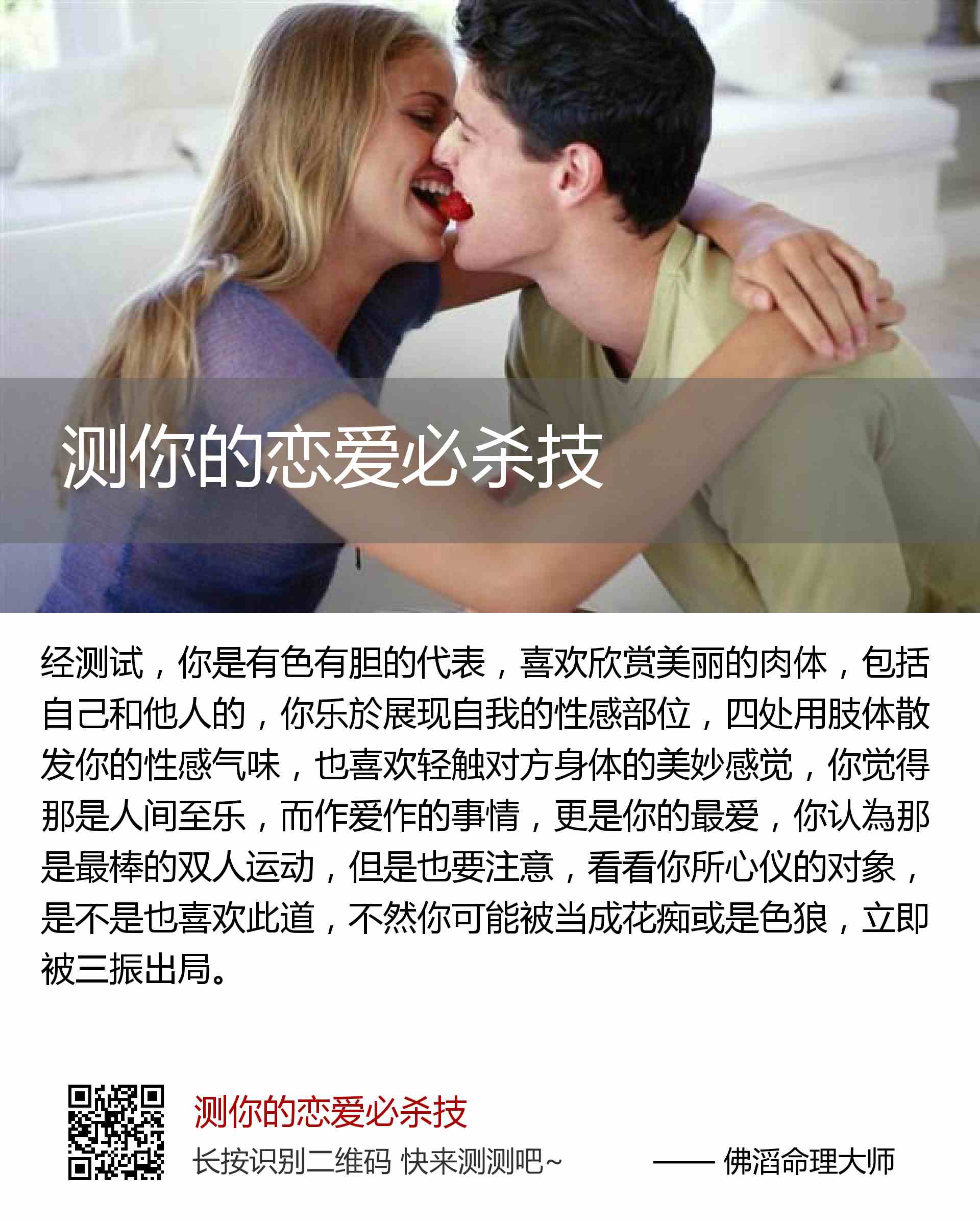 你是有色有胆的代表,喜欢欣赏美丽的肉体,包括自己和他人的,你乐於展现自我的性感部位,四处用肢体散发你的性感气味,也喜欢轻触对方身体的美妙感觉,你觉得那是人间至乐,而作爱作的事情,更是你的最爱,你认為那是最棒的双人运动,但是也要注意,看看你所心仪的对象,是不是也喜欢此道,不然你可能被当成花痴或是色狼,立即被三振出局。