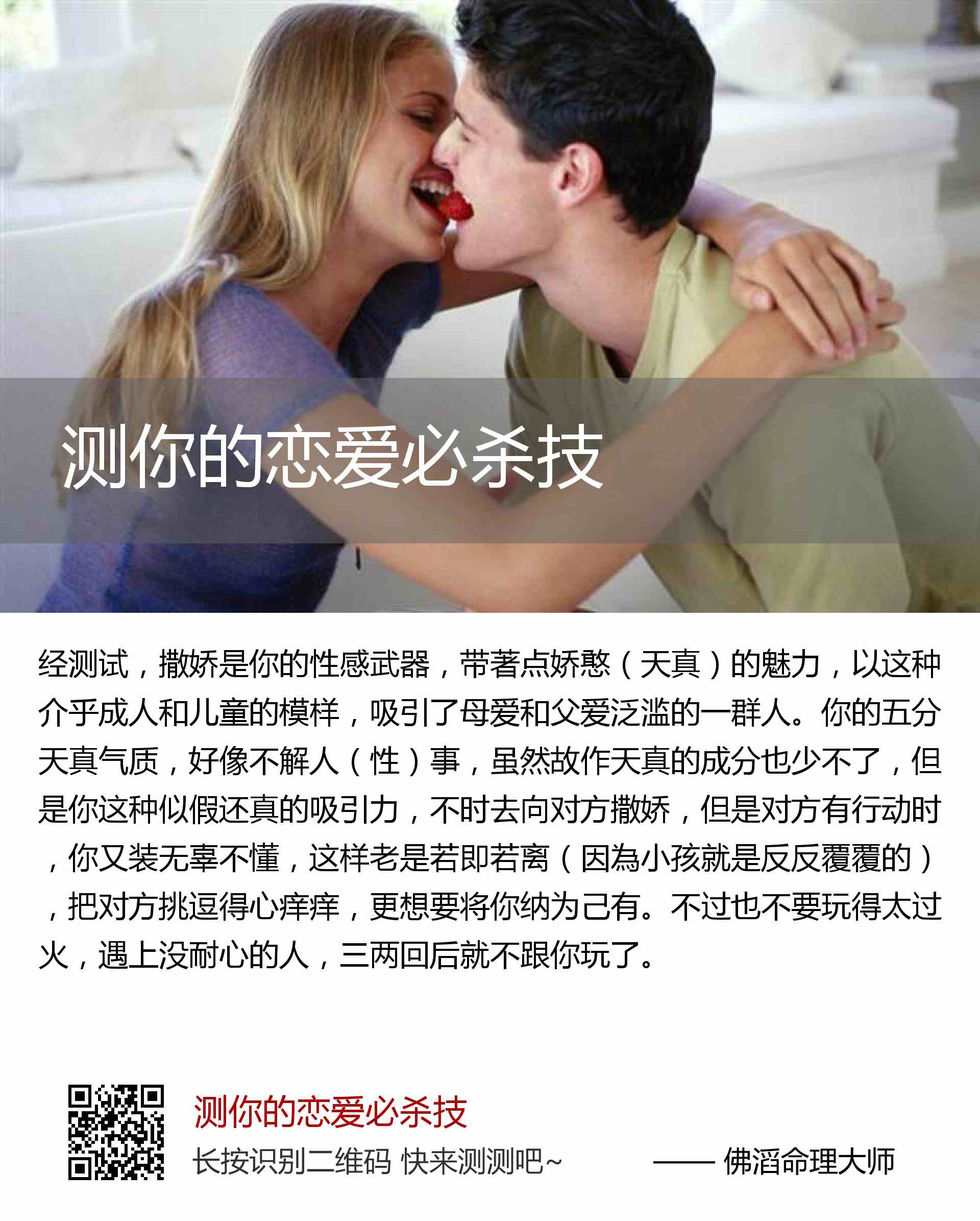 你的五分天真气质,好像不解人(性)事,虽然故作天真的成分也少不了,但是你这种似假还真的吸引力,不时去向对方撒娇,但是对方有行动时,你又装无辜不懂,这样老是若即若离(因為小孩就是反反覆覆的),把对方挑逗得心痒痒,更想要将你纳为己有。不过也不要玩得太过火,遇上没耐心的人,三两回后就不跟你玩了。