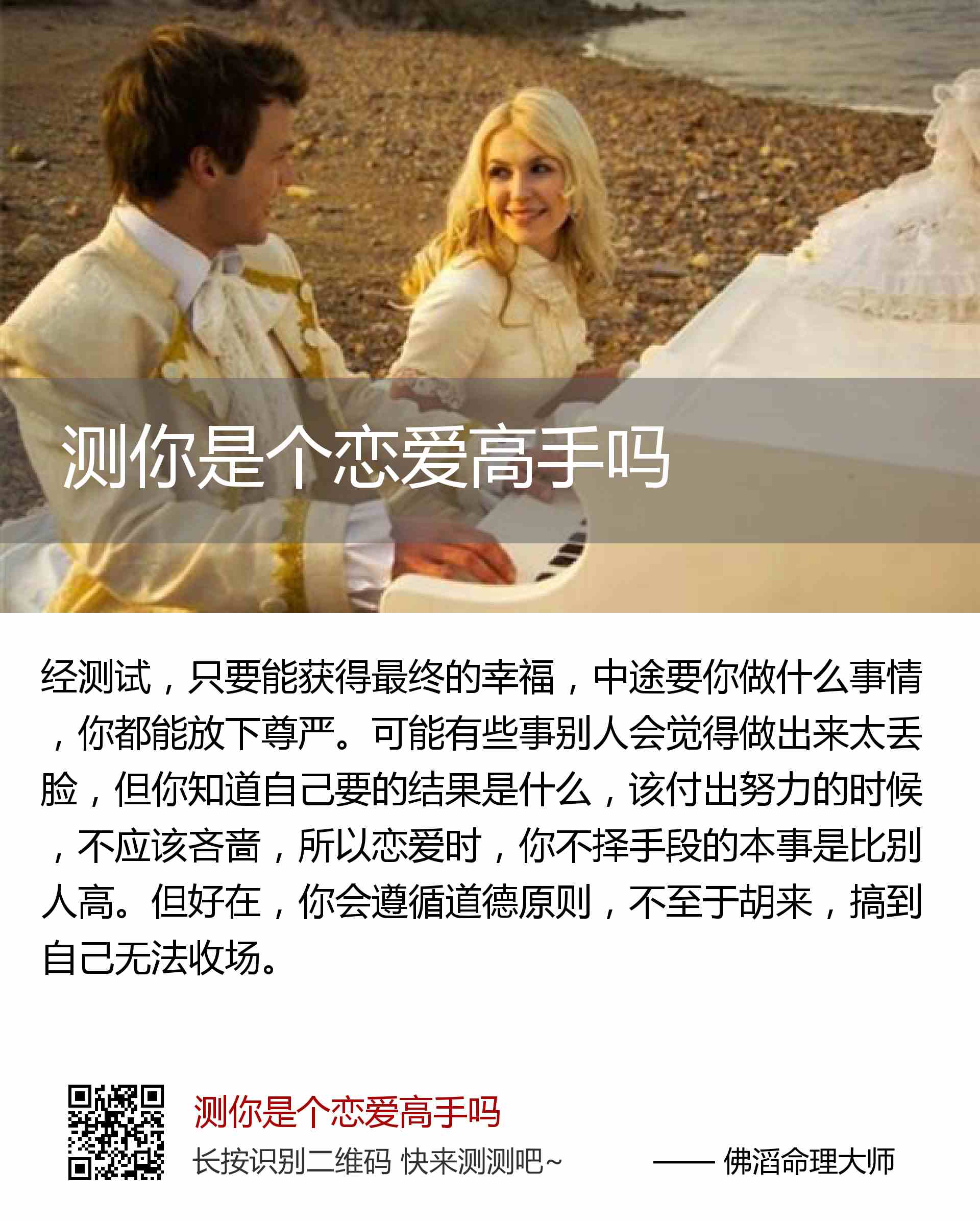 可能有些事别人会觉得做出来太丢脸,但你知道自己要的结果是什么,该付出努力的时候,不应该吝啬,所以恋爱时,你不择手段的本事是比别人高。但好在,你会遵循道德原则,不至于胡来,搞到自己无法收场。