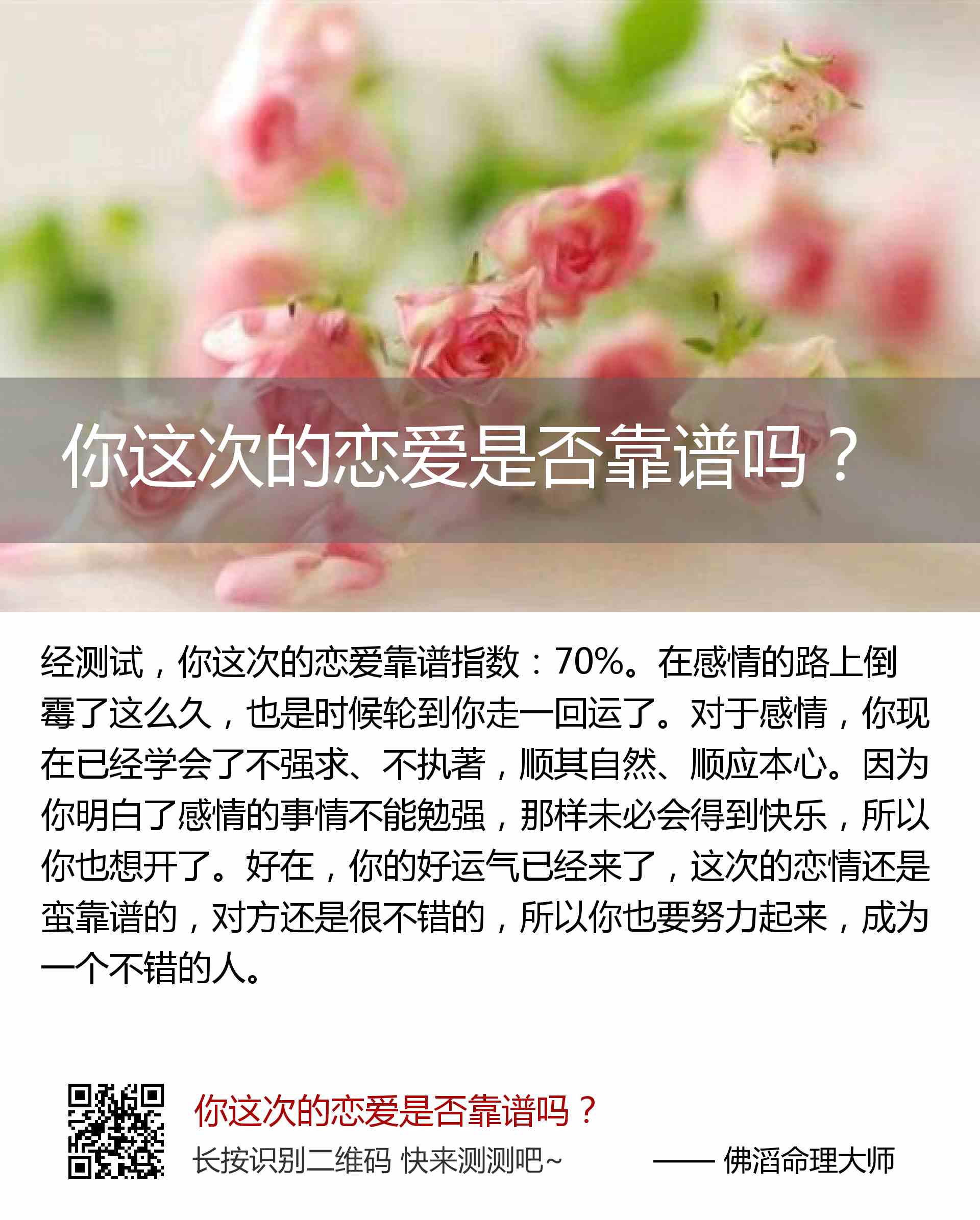 在感情的路上倒霉了这么久,也是时候轮到你走一回运了。对于感情,你现在已经学会了不强求、不执著,顺其自然、顺应本心。因为你明白了感情的事情不能勉强,那样未必会得到快乐,所以你也想开了。好在,你的好运气已经来了,这次的恋情还是蛮靠谱的,对方还是很不错的,所以你也要努力起来,成为一个不错的人。