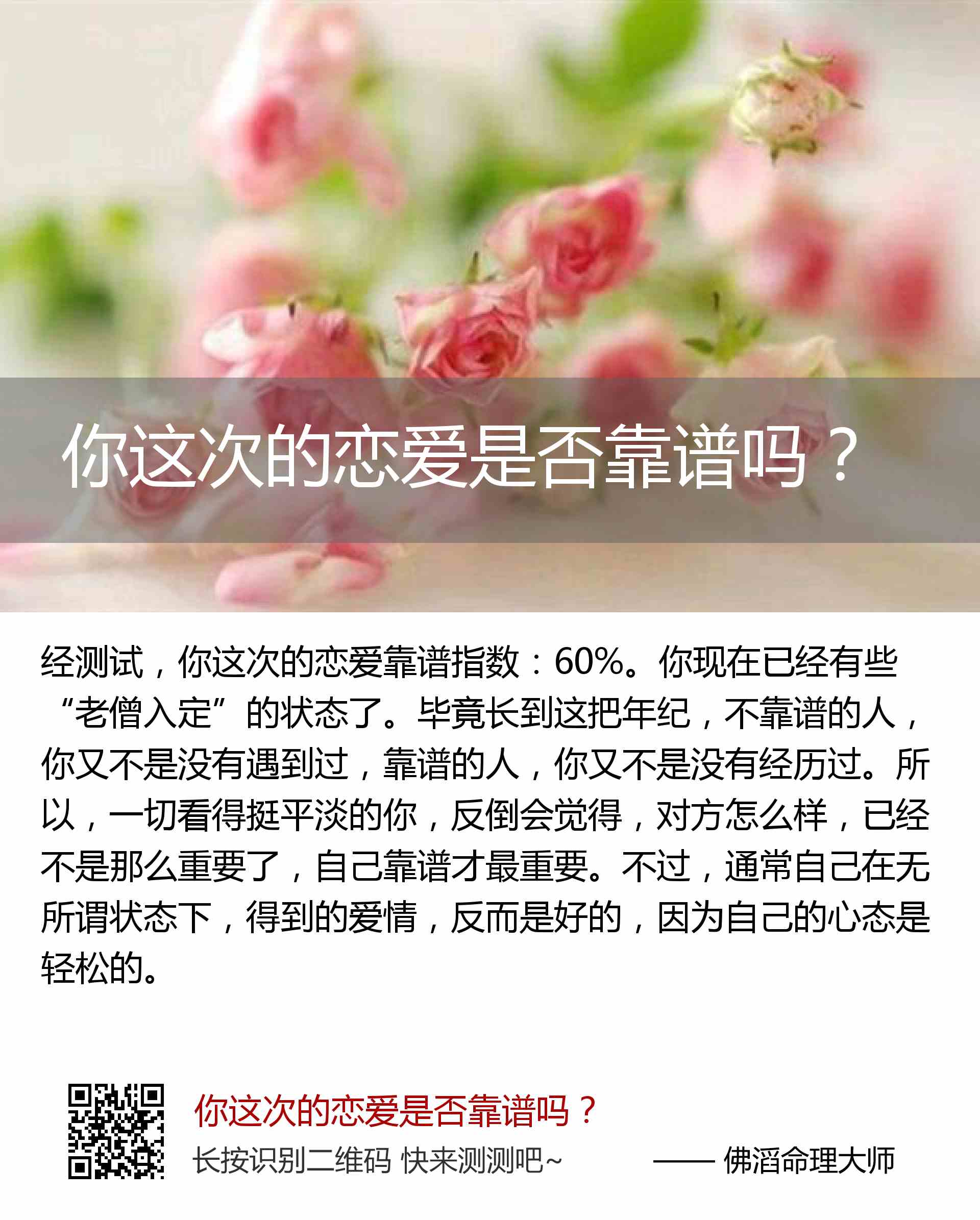 你现在已经有些“老僧入定”的状态了。毕竟长到这把年纪,不靠谱的人,你又不是没有遇到过,靠谱的人,你又不是没有经历过。所以,一切看得挺平淡的你,反倒会觉得,对方怎么样,已经不是那么重要了,自己靠谱才最重要。不过,通常自己在无所谓状态下,得到的爱情,反而是好的,因为自己的心态是轻松的。