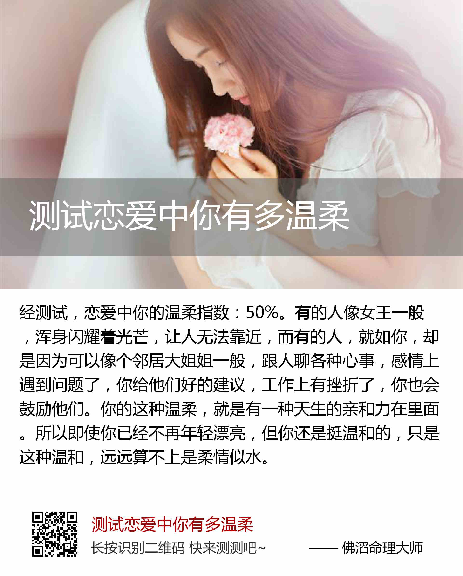 有的人像女王一般,浑身闪耀着光芒,让人无法靠近,而有的人,就如你,却是因为可以像个邻居大姐姐一般,跟人聊各种心事,感情上遇到问题了,你给他们好的建议,工作上有挫折了,你也会鼓励他们。你的这种温柔,就是有一种天生的亲和力在里面。所以即使你已经不再年轻漂亮,但你还是挺温和的,只是这种温和,远远算不上是柔情似水。