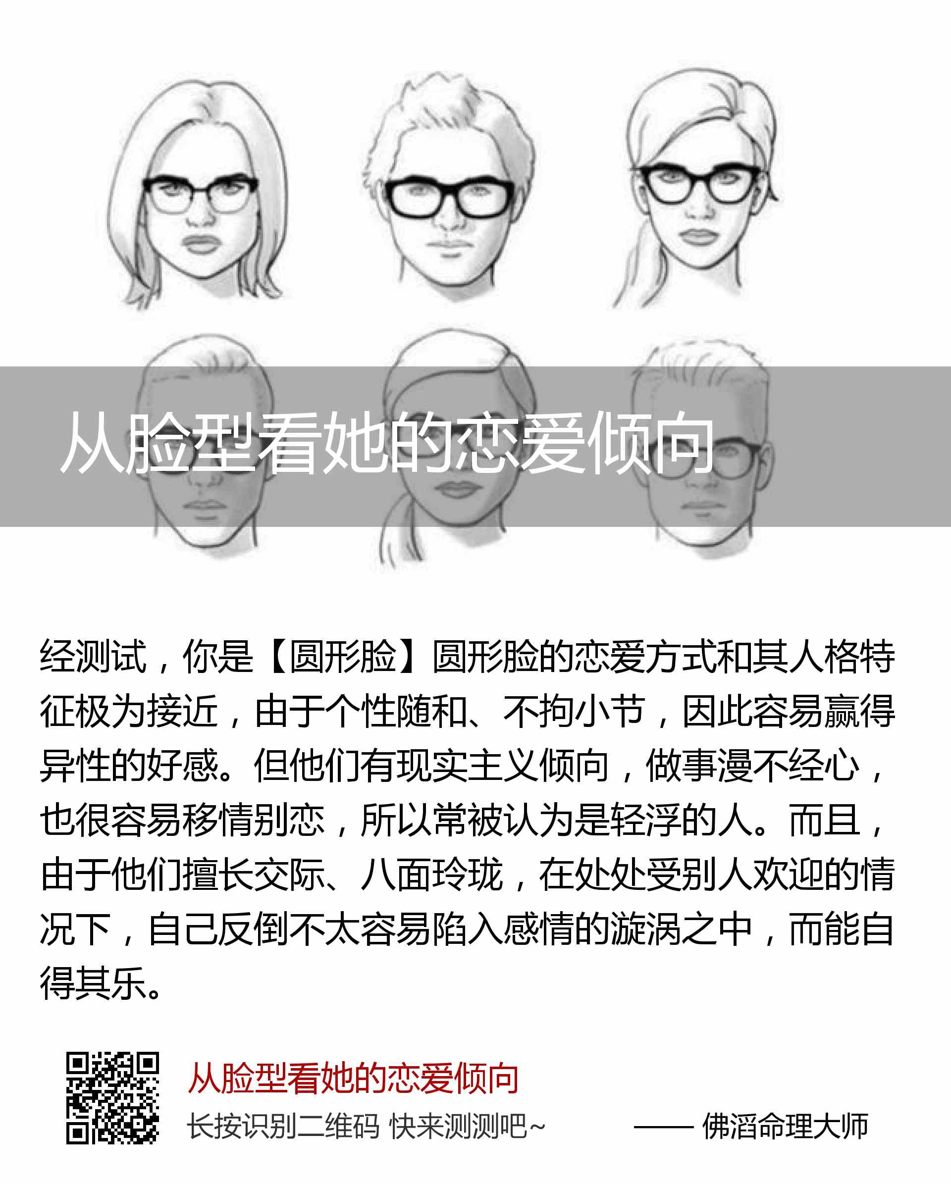 你是【圆形脸】圆形脸的恋爱方式和其人格特征极为接近,由于个性随和、不拘小节,因此容易赢得异性的好感。