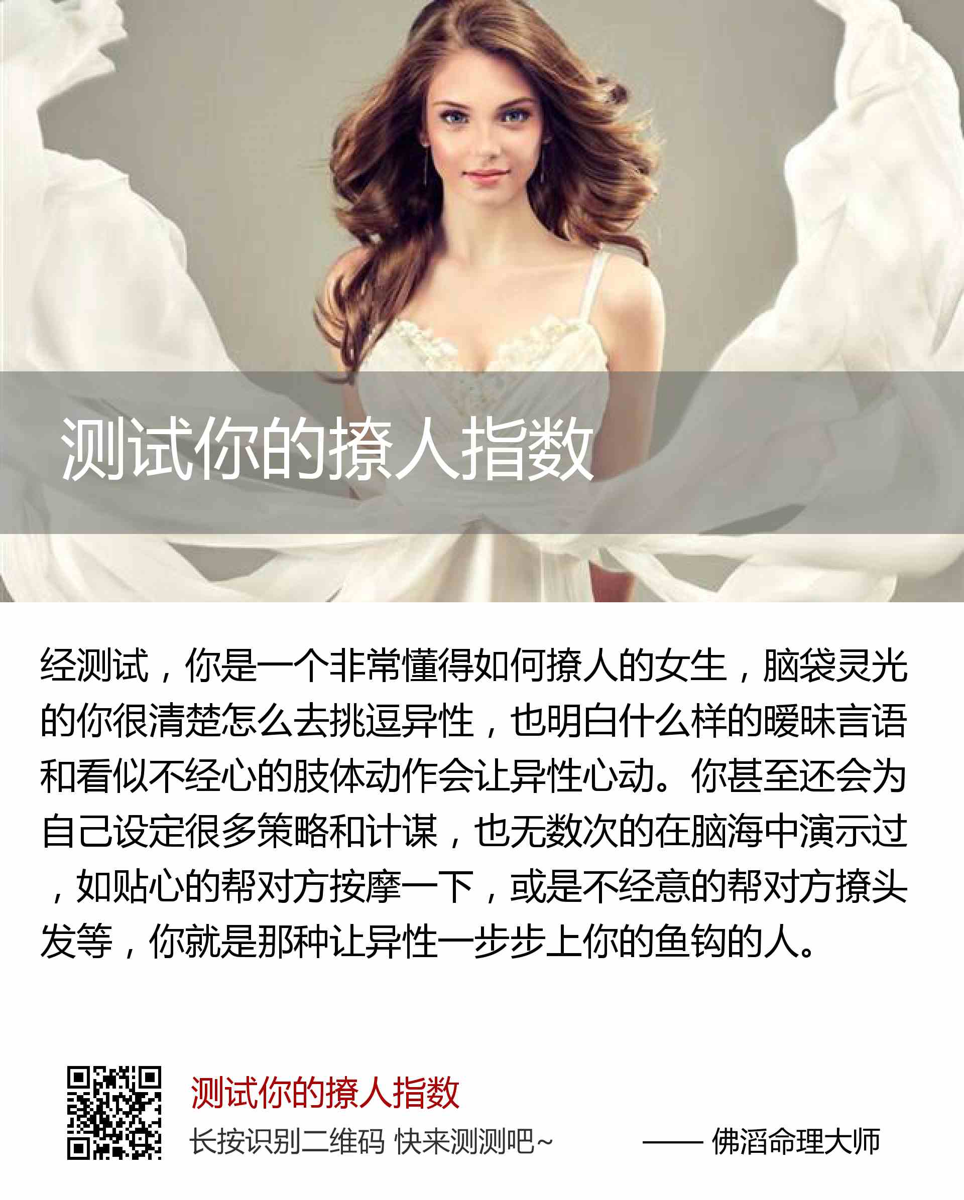 你是一个非常懂得如何撩人的女生,脑袋灵光的你很清楚怎么去挑逗异性,也明白什么样的暧昧言语和看似不经心的肢体动作会让异性心动。