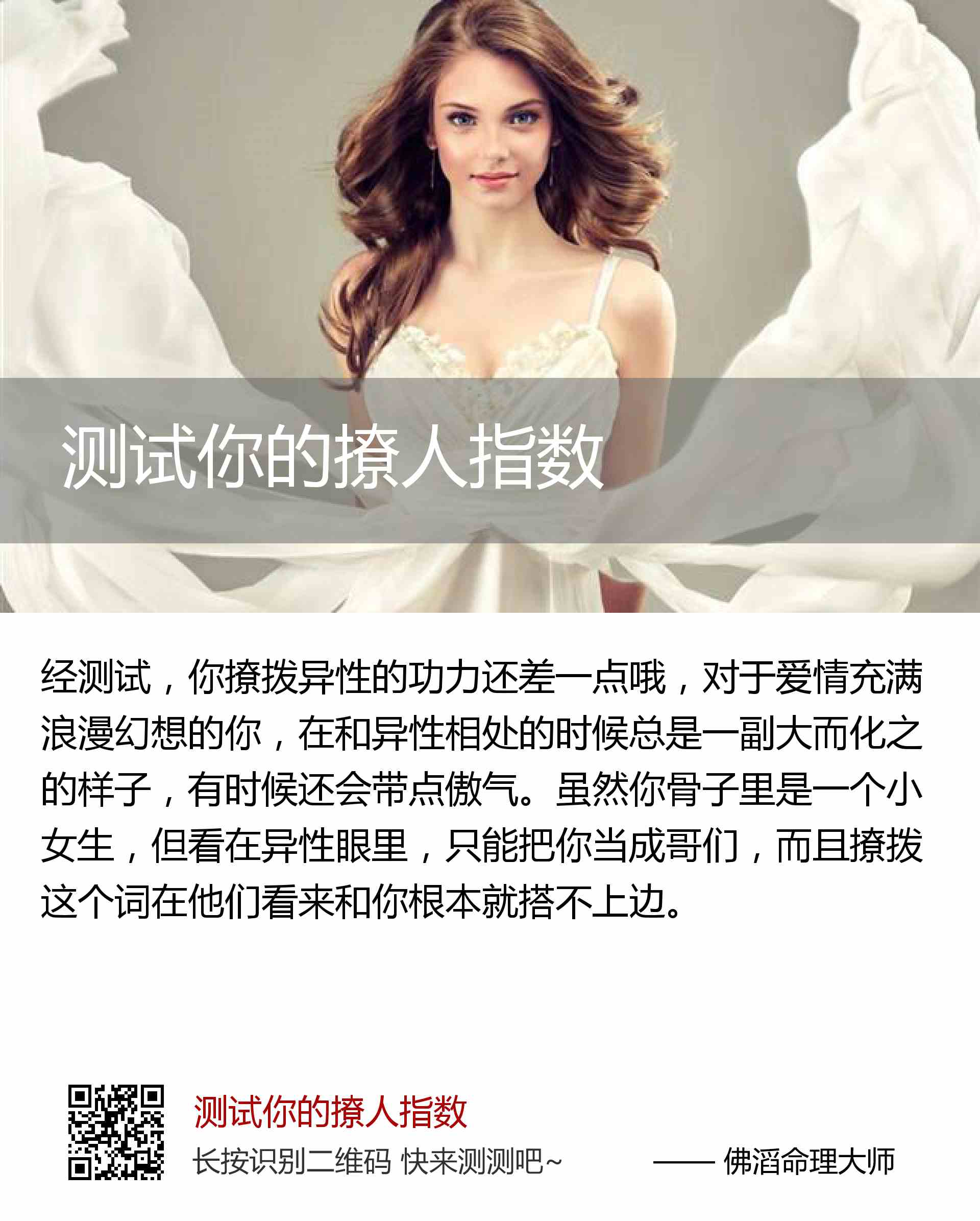 你撩拨异性的功力还差一点哦,对于爱情充满浪漫幻想的你,在和异性相处的时候总是一副大而化之的样子,有时候还会带点傲气。