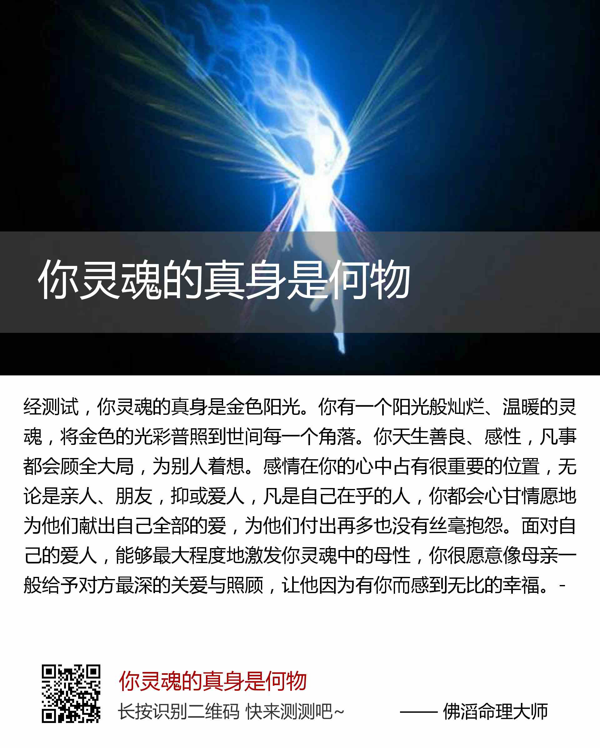 你有一个阳光般灿烂、温暖的灵魂,将金色的光彩普照到世间每一个角落。你天生善良、感性,凡事都会顾全大局,为别人着想。感情在你的心中占有很重要的位置,无论是亲人、朋友,抑或爱人,凡是自己在乎的人,你都会心甘情愿地为他们献出自己全部的爱,为他们付出再多也没有丝毫抱怨。面对自己的爱人,能够最大程度地激发你灵魂中的母性,你很愿意像母亲一般给予对方最深的关爱与照顾,让他因为有你而感到无比的幸福。-