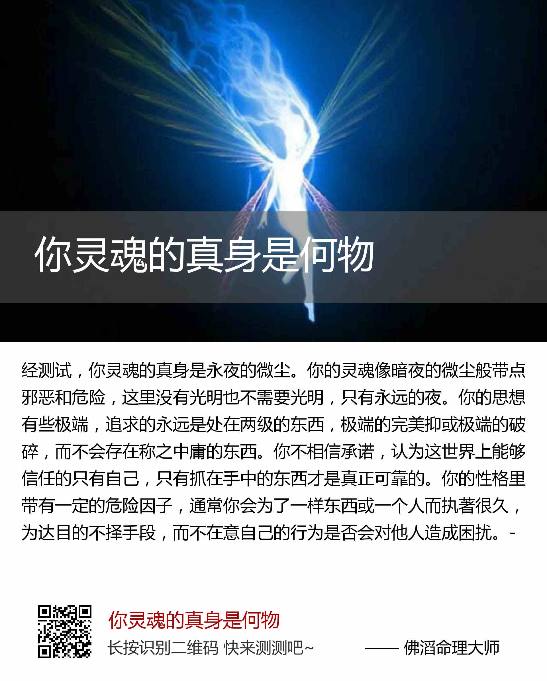 你的灵魂像暗夜的微尘般带点邪恶和危险,这里没有光明也不需要光明,只有永远的夜。你的思想有些极端,追求的永远是处在两级的东西,极端的完美抑或极端的破碎,而不会存在称之中庸的东西。你不相信承诺,认为这世界上能够信任的只有自己,只有抓在手中的东西才是真正可靠的。你的性格里带有一定的危险因子,通常你会为了一样东西或一个人而执著很久,为达目的不择手段,而不在意自己的行为是否会对他人造成困扰。-