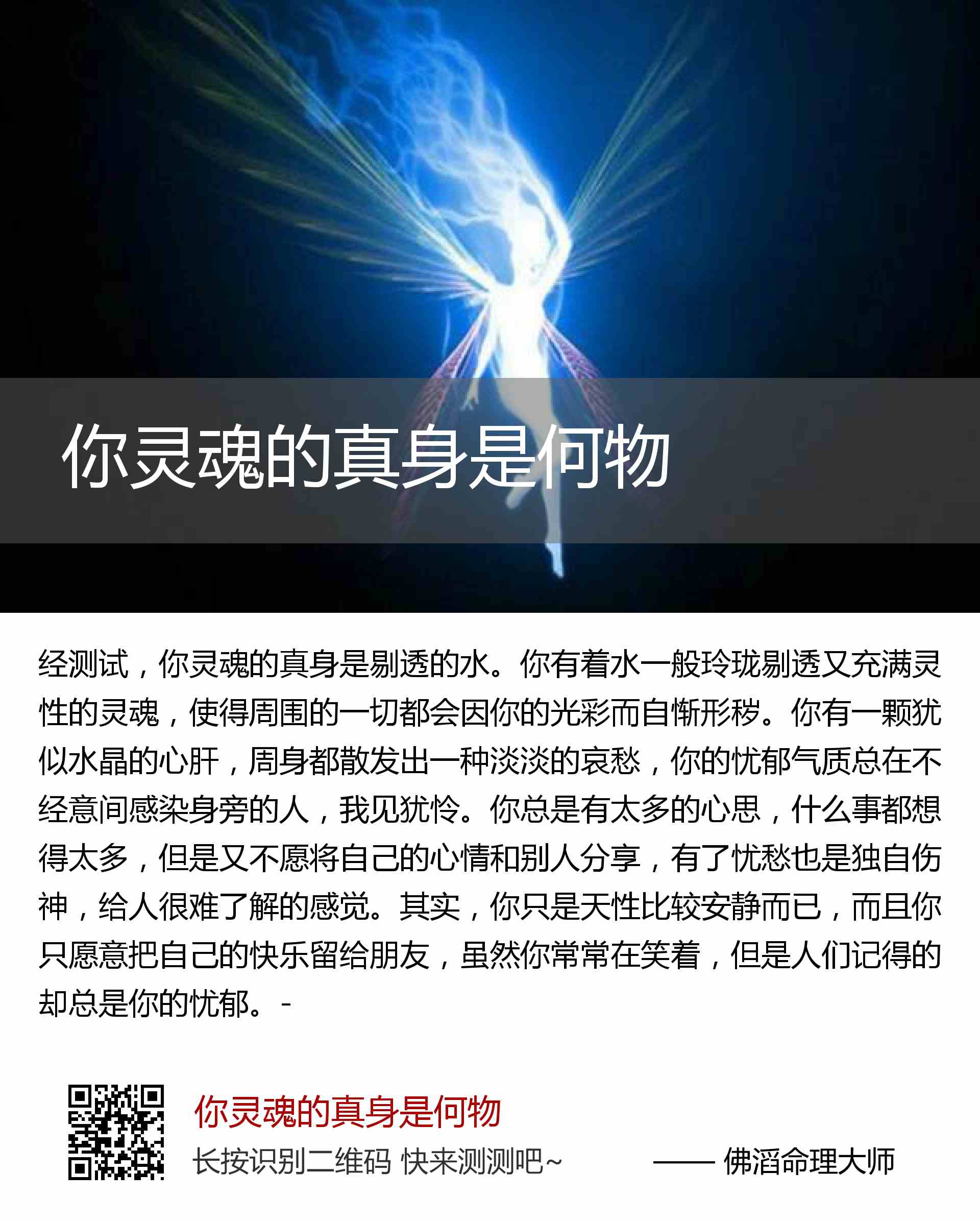 你有着水一般玲珑剔透又充满灵性的灵魂,使得周围的一切都会因你的光彩而自惭形秽。你有一颗犹似水晶的心肝,周身都散发出一种淡淡的哀愁,你的忧郁气质总在不经意间感染身旁的人,我见犹怜。你总是有太多的心思,什么事都想得太多,但是又不愿将自己的心情和别人分享,有了忧愁也是独自伤神,给人很难了解的感觉。其实,你只是天性比较安静而已,而且你只愿意把自己的快乐留给朋友,虽然你常常在笑着,但是人们记得的却总是你的忧郁。-