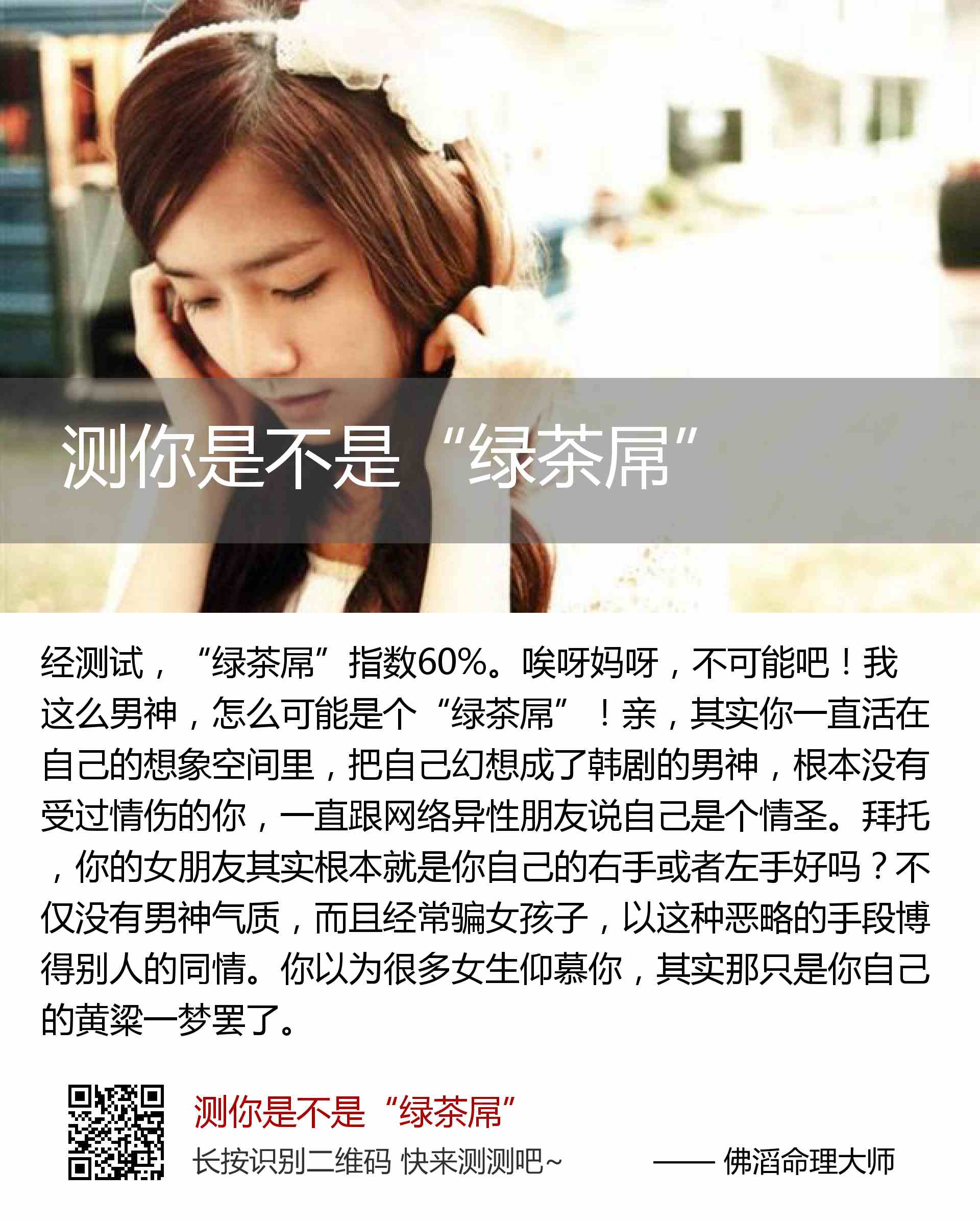 唉呀妈呀,不可能吧!我这么男神,怎么可能是个“绿茶屌”!亲,其实你一直活在自己的想象空间里,把自己幻想成了韩剧的男神,根本没有受过情伤的你,一直跟网络异性朋友说自己是个情圣。拜托,你的女朋友其实根本就是你自己的右手或者左手好吗?不仅没有男神气质,而且经常骗女孩子,以这种恶略的手段博得别人的同情。你以为很多女生仰慕你,其实那只是你自己的黄粱一梦罢了。