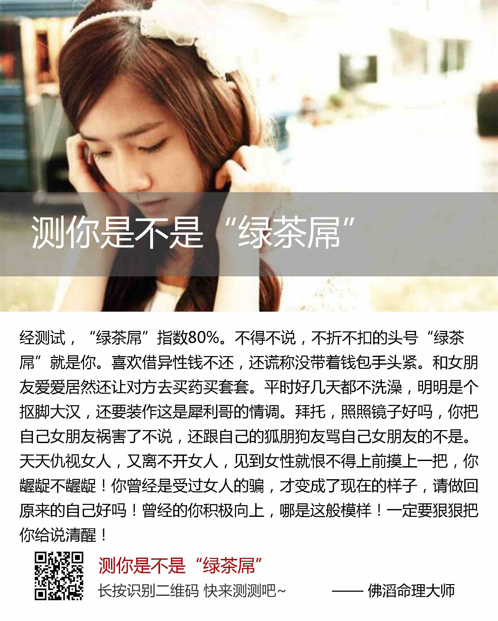 不得不说,不折不扣的头号“绿茶屌”就是你。喜欢借异性钱不还,还谎称没带着钱包手头紧。和女朋友爱爱居然还让对方去买药买套套。平时好几天都不洗澡,明明是个抠脚大汉,还要装作这是犀利哥的情调。拜托,照照镜子好吗,你把自己女朋友祸害了不说,还跟自己的狐朋狗友骂自己女朋友的不是。天天仇视女人,又离不开女人,见到女性就恨不得上前摸上一把,你龌龊不龌龊!你曾经是受过女人的骗,才变成了现在的样子,请做回原来的自己好吗!曾经的你积极向上,哪是这般模样!一定要狠狠把你给说清醒!