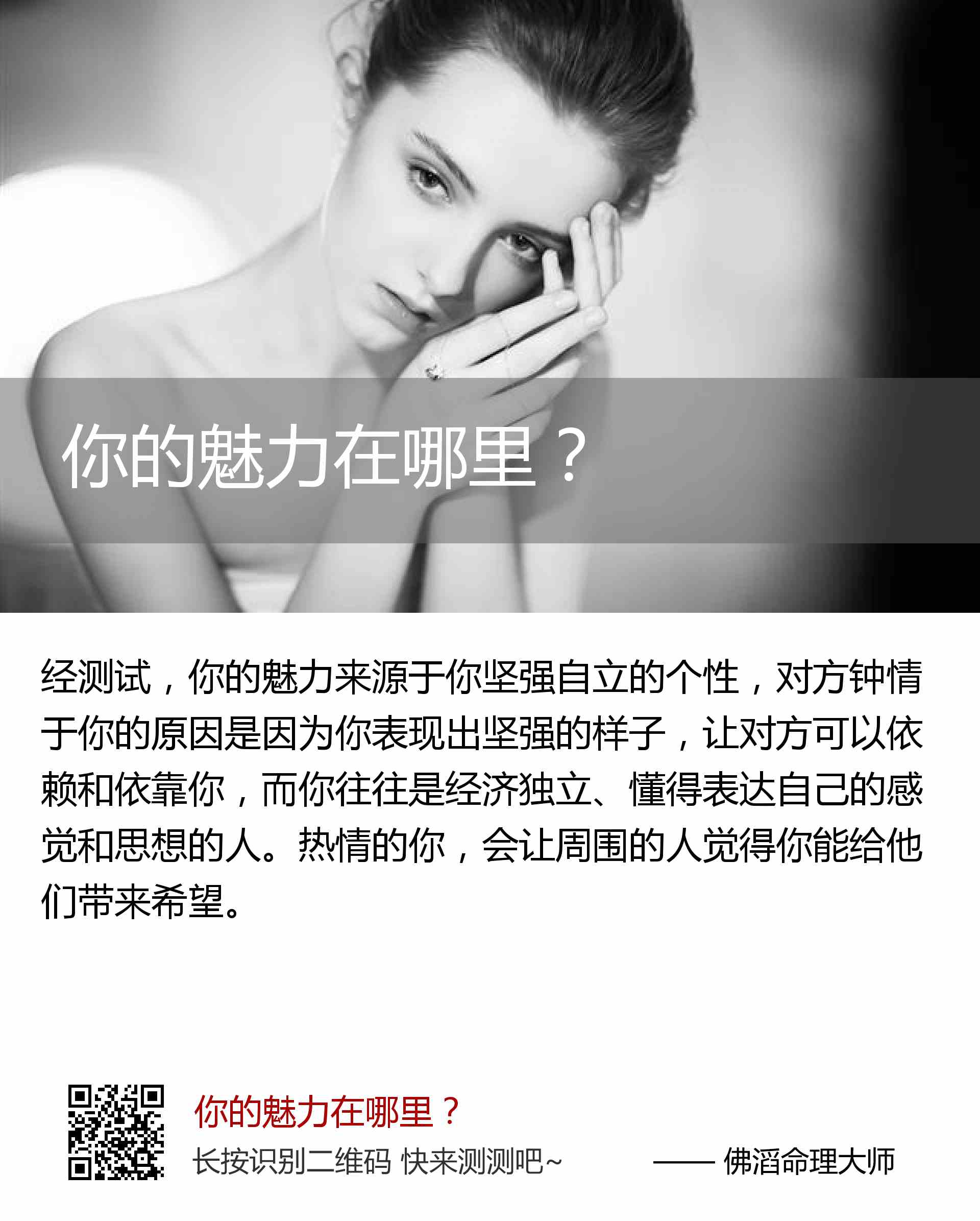 你的魅力来源于你坚强自立的个性,对方钟情于你的原因是因为你表现出坚强的样子,让对方可以依赖和依靠你,而你往往是经济独立、懂得表达自己的感觉和思想的人。