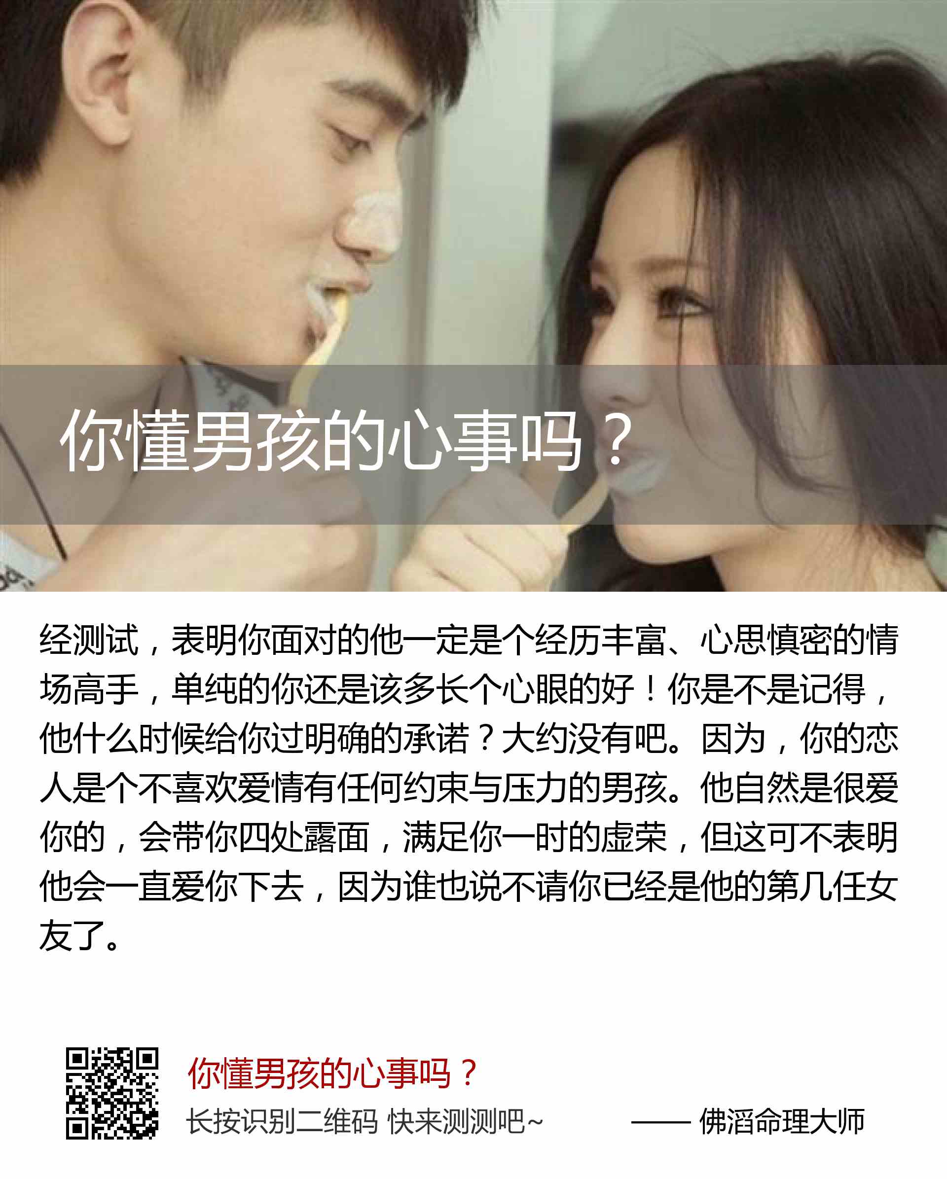 表明你面对的他一定是个经历丰富、心思慎密的情场高手,单纯的你还是该多长个心眼的好!你是不是记得,他什么时候给你过明确的承诺?大约没有吧。