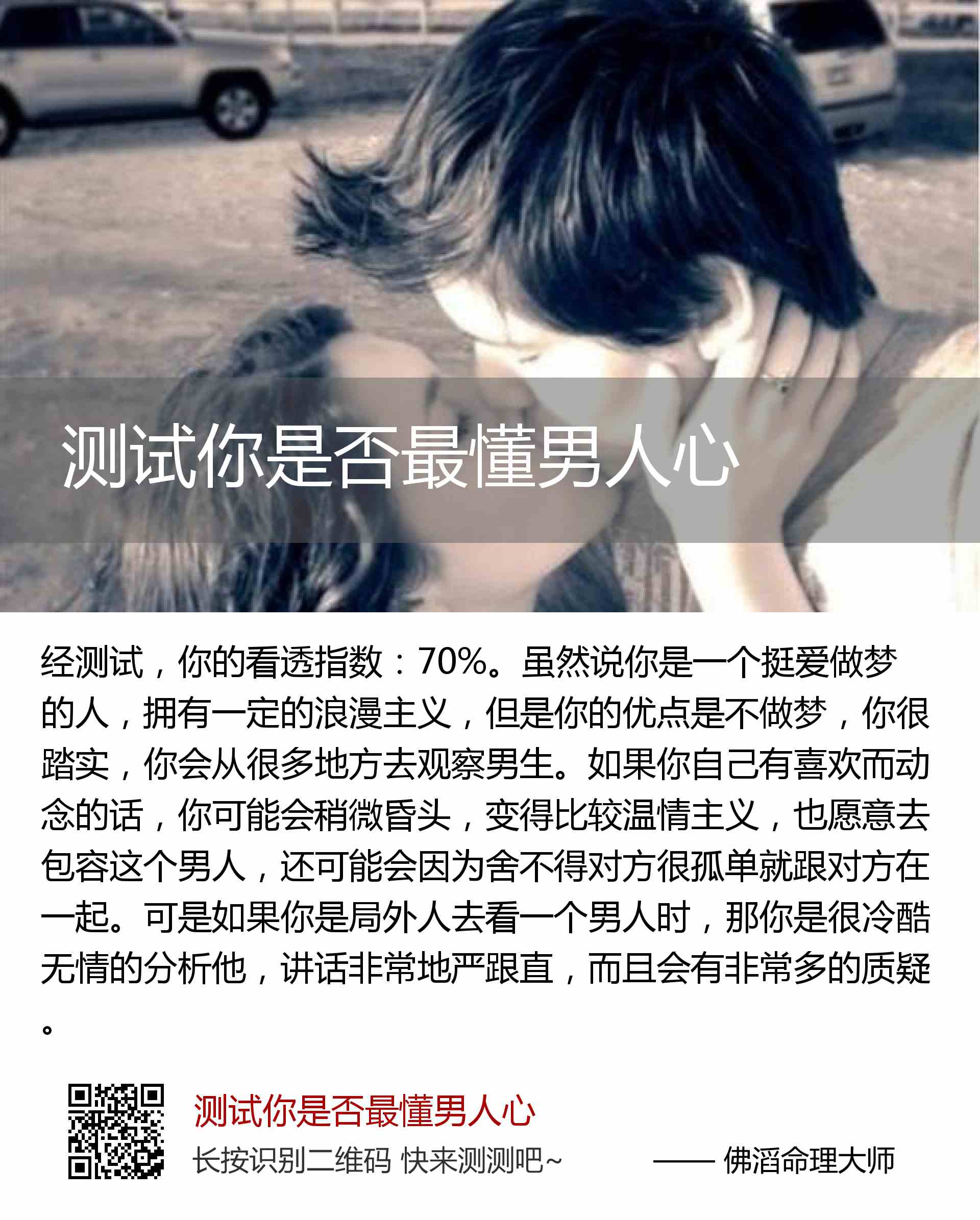 虽然说你是一个挺爱做梦的人,拥有一定的浪漫主义,但是你的优点是不做梦,你很踏实,你会从很多地方去观察男生。如果你自己有喜欢而动念的话,你可能会稍微昏头,变得比较温情主义,也愿意去包容这个男人,还可能会因为舍不得对方很孤单就跟对方在一起。可是如果你是局外人去看一个男人时,那你是很冷酷无情的分析他,讲话非常地严跟直,而且会有非常多的质疑。
