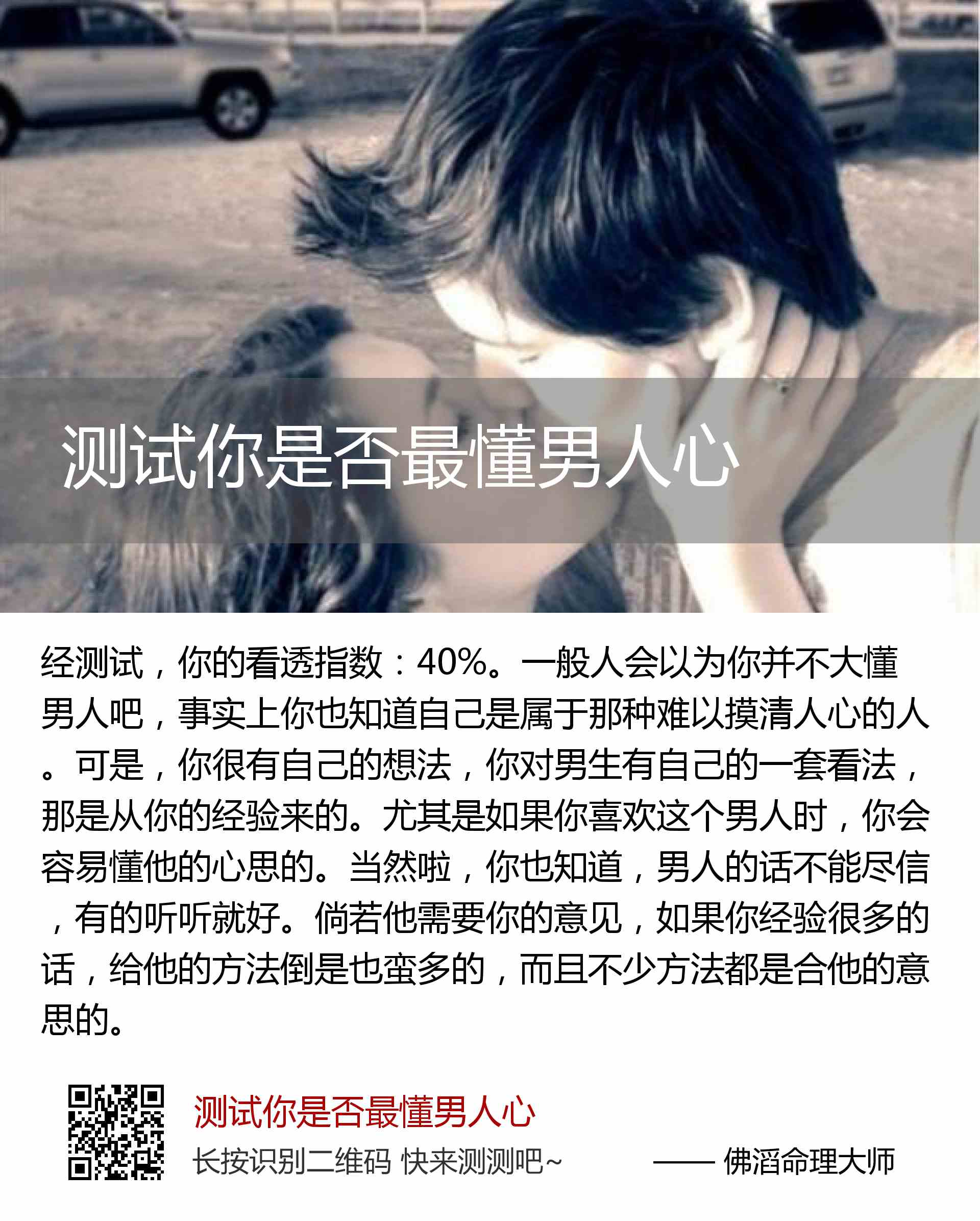 一般人会以为你并不大懂男人吧,事实上你也知道自己是属于那种难以摸清人心的人。可是,你很有自己的想法,你对男生有自己的一套看法,那是从你的经验来的。尤其是如果你喜欢这个男人时,你会容易懂他的心思的。当然啦,你也知道,男人的话不能尽信,有的听听就好。倘若他需要你的意见,如果你经验很多的话,给他的方法倒是也蛮多的,而且不少方法都是合他的意思的。