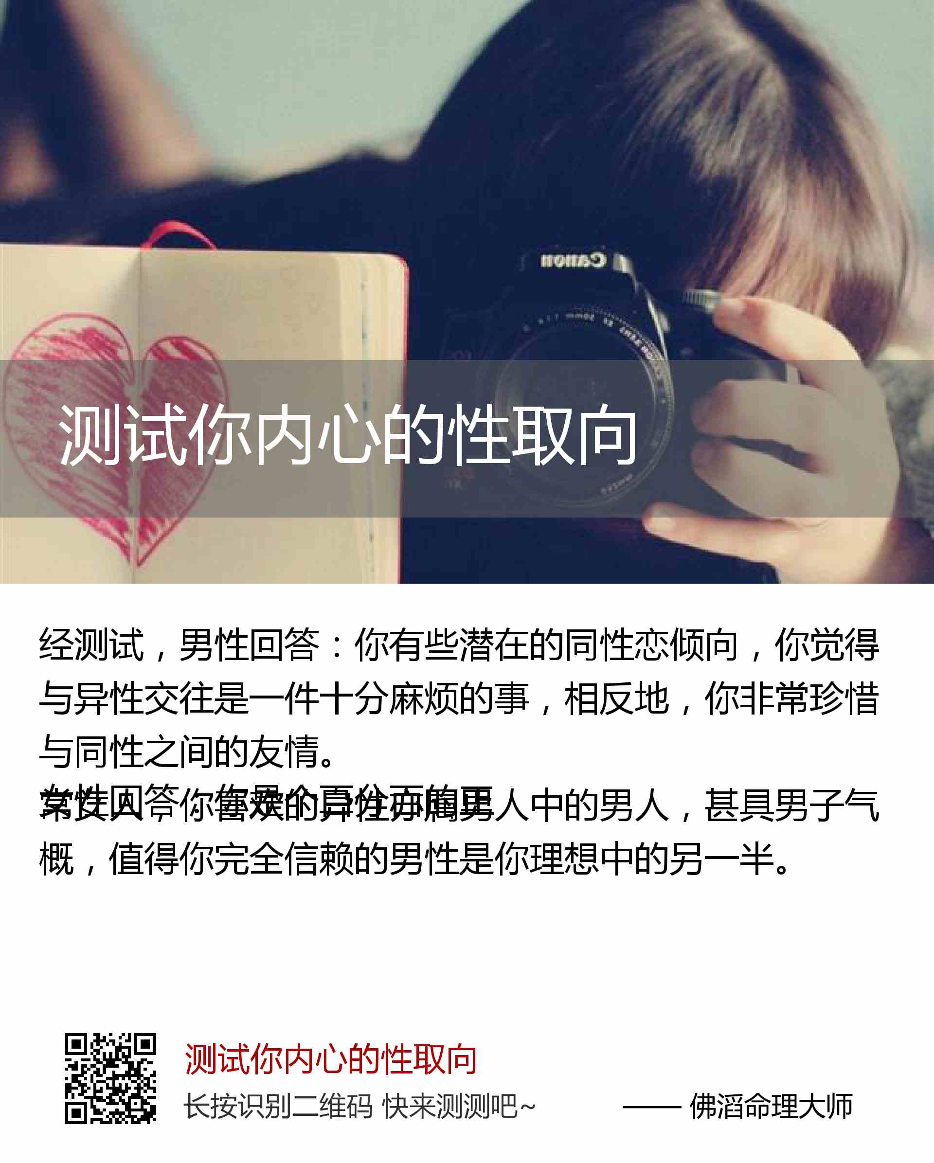 男性回答:你有些潜在的同性恋倾向,你觉得与异性交往是一件十分麻烦的事,相反地,你非常珍惜与同性之间的友情。