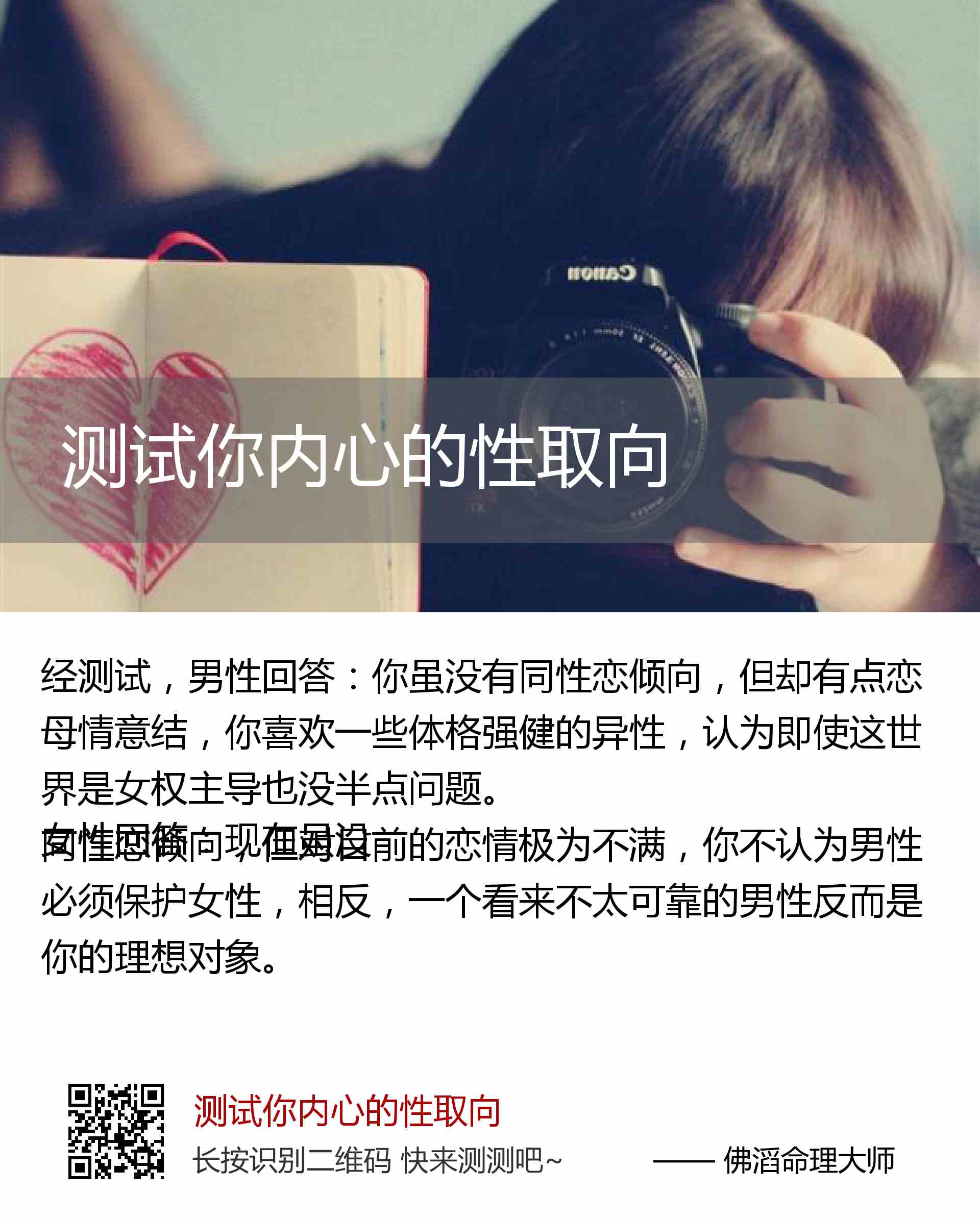 男性回答:你虽没有同性恋倾向,但却有点恋母情意结,你喜欢一些体格强健的异性,认为即使这世界是女权主导也没半点问题。