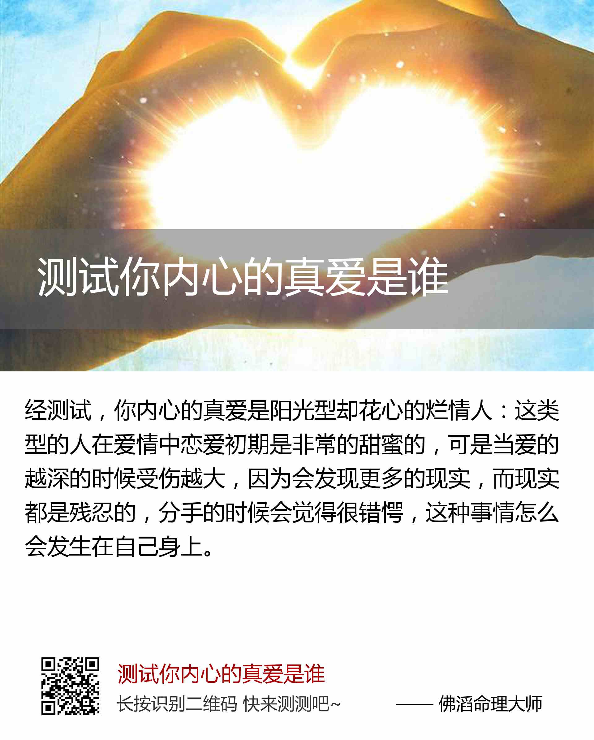 你内心的真爱是阳光型却花心的烂情人:这类型的人在爱情中恋爱初期是非常的甜蜜的,可是当爱的越深的时候受伤越大,因为会发现更多的现实,而现实都是残忍的,分手的时候会觉得很错愕,这种事情怎么会发生在自己身上。
