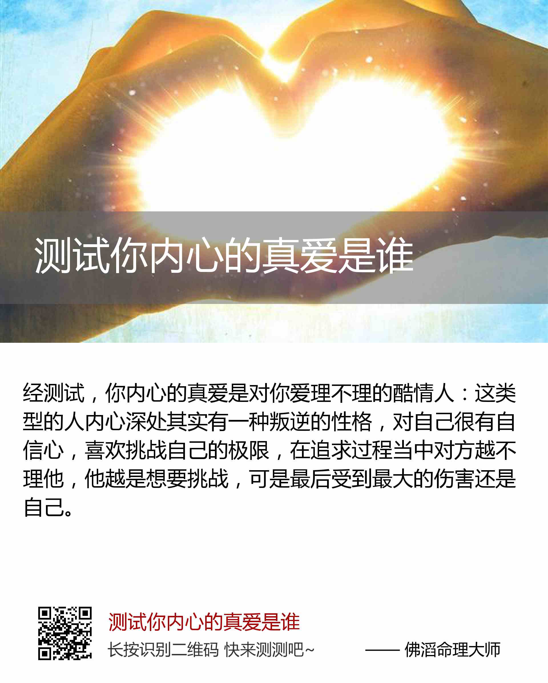 你内心的真爱是对你爱理不理的酷情人:这类型的人内心深处其实有一种叛逆的性格,对自己很有自信心,喜欢挑战自己的极限,在追求过程当中对方越不理他,他越是想要挑战,可是最后受到最大的伤害还是自己。