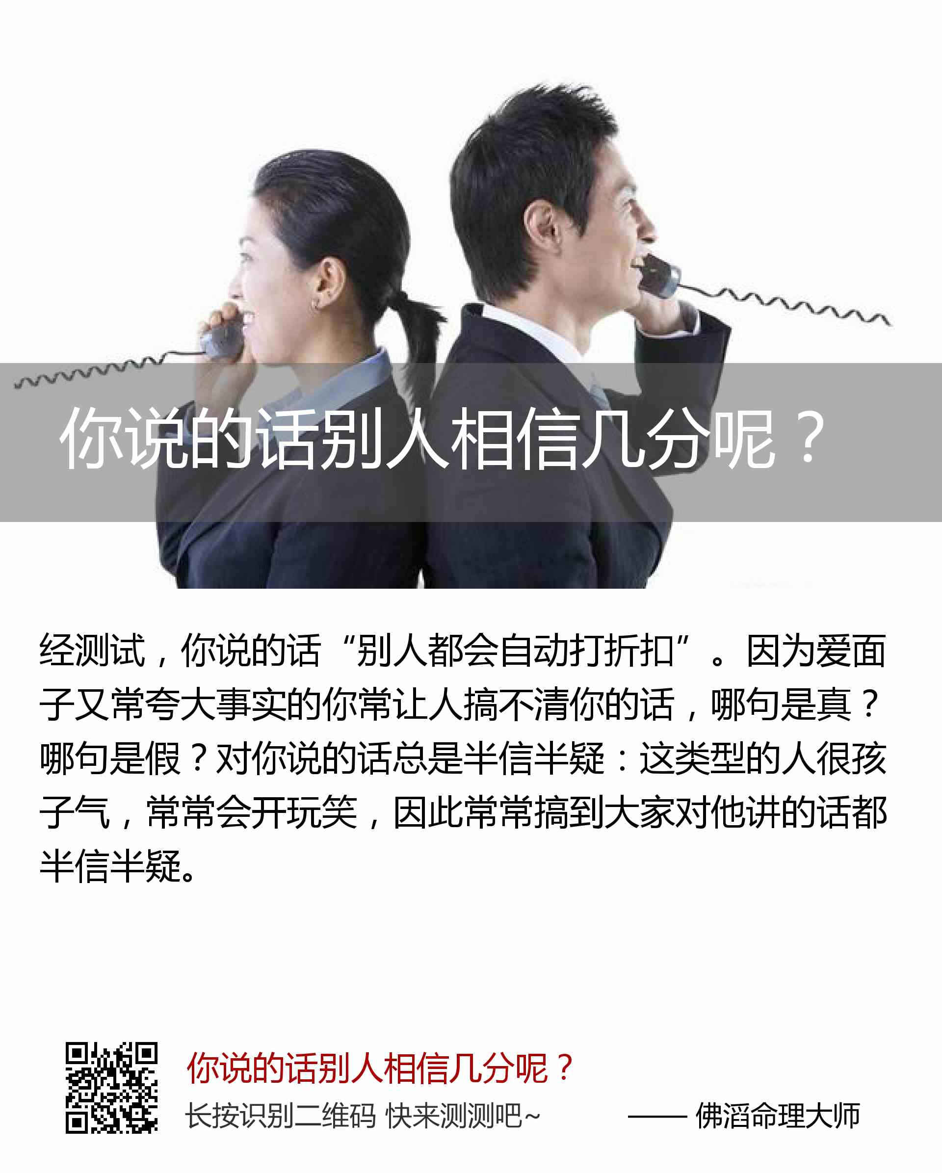 因为爱面子又常夸大事实的你常让人搞不清你的话,哪句是真?哪句是假?对你说的话总是半信半疑:这类型的人很孩子气,常常会开玩笑,因此常常搞到大家对他讲的话都半信半疑。