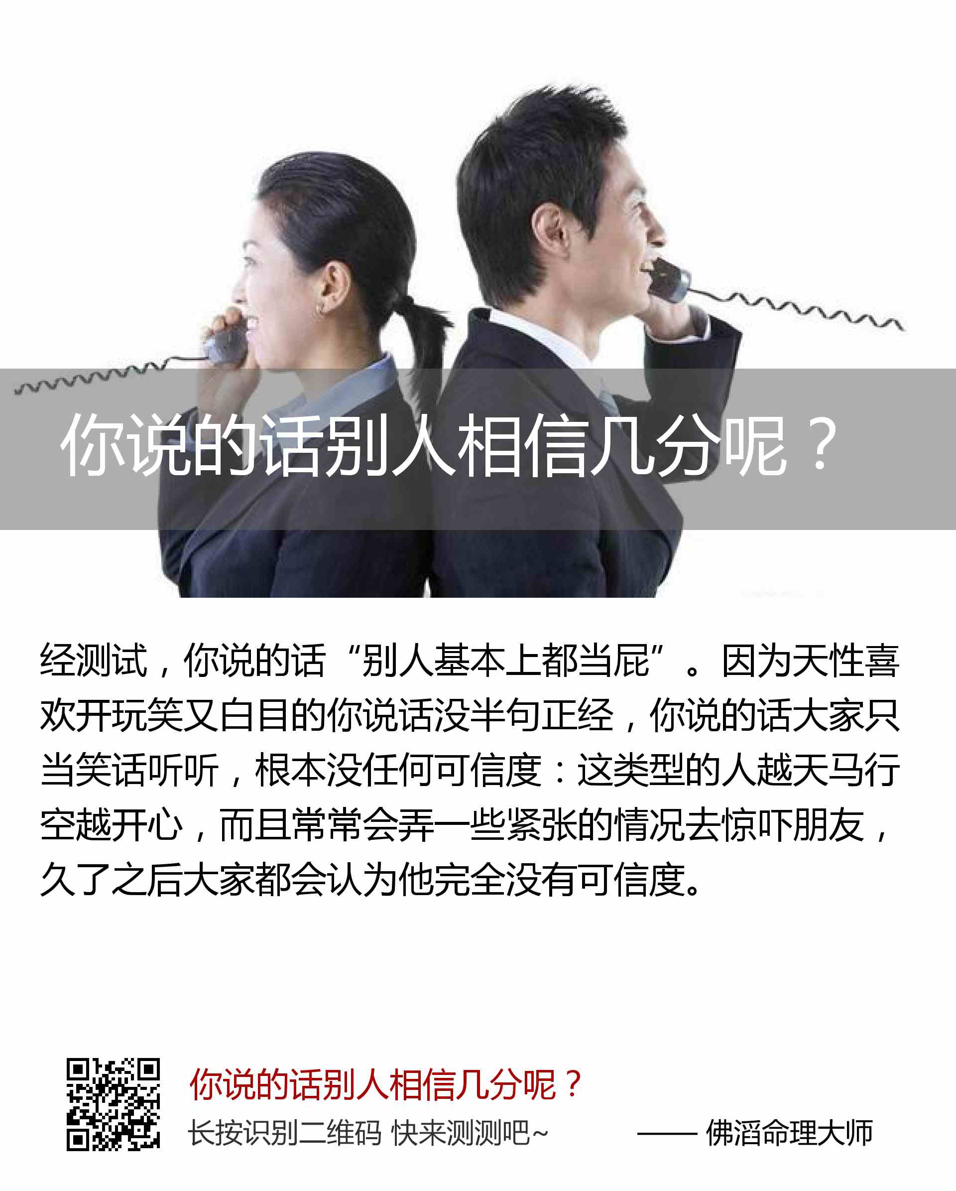 因为天性喜欢开玩笑又白目的你说话没半句正经,你说的话大家只当笑话听听,根本没任何可信度:这类型的人越天马行空越开心,而且常常会弄一些紧张的情况去惊吓朋友,久了之后大家都会认为他完全没有可信度。