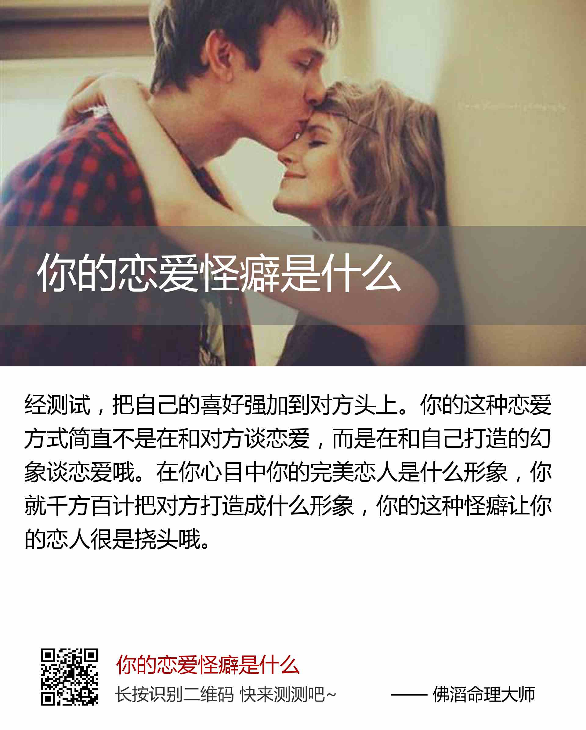 你的这种恋爱方式简直不是在和对方谈恋爱,而是在和自己打造的幻象谈恋爱哦。在你心目中你的完美恋人是什么形象,你就千方百计把对方打造成什么形象,你的这种怪癖让你的恋人很是挠头哦。