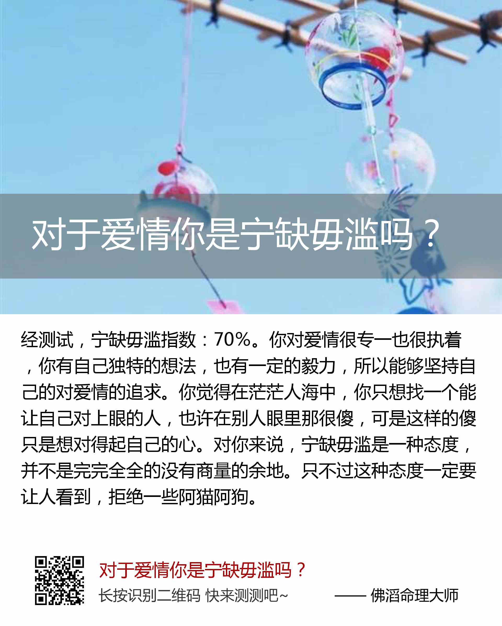 你对爱情很专一也很执着,你有自己独特的想法,也有一定的毅力,所以能够坚持自己的对爱情的追求。你觉得在茫茫人海中,你只想找一个能让自己对上眼的人,也许在别人眼里那很傻,可是这样的傻只是想对得起自己的心。对你来说,宁缺毋滥是一种态度,并不是完完全全的没有商量的余地。只不过这种态度一定要让人看到,拒绝一些阿猫阿狗。