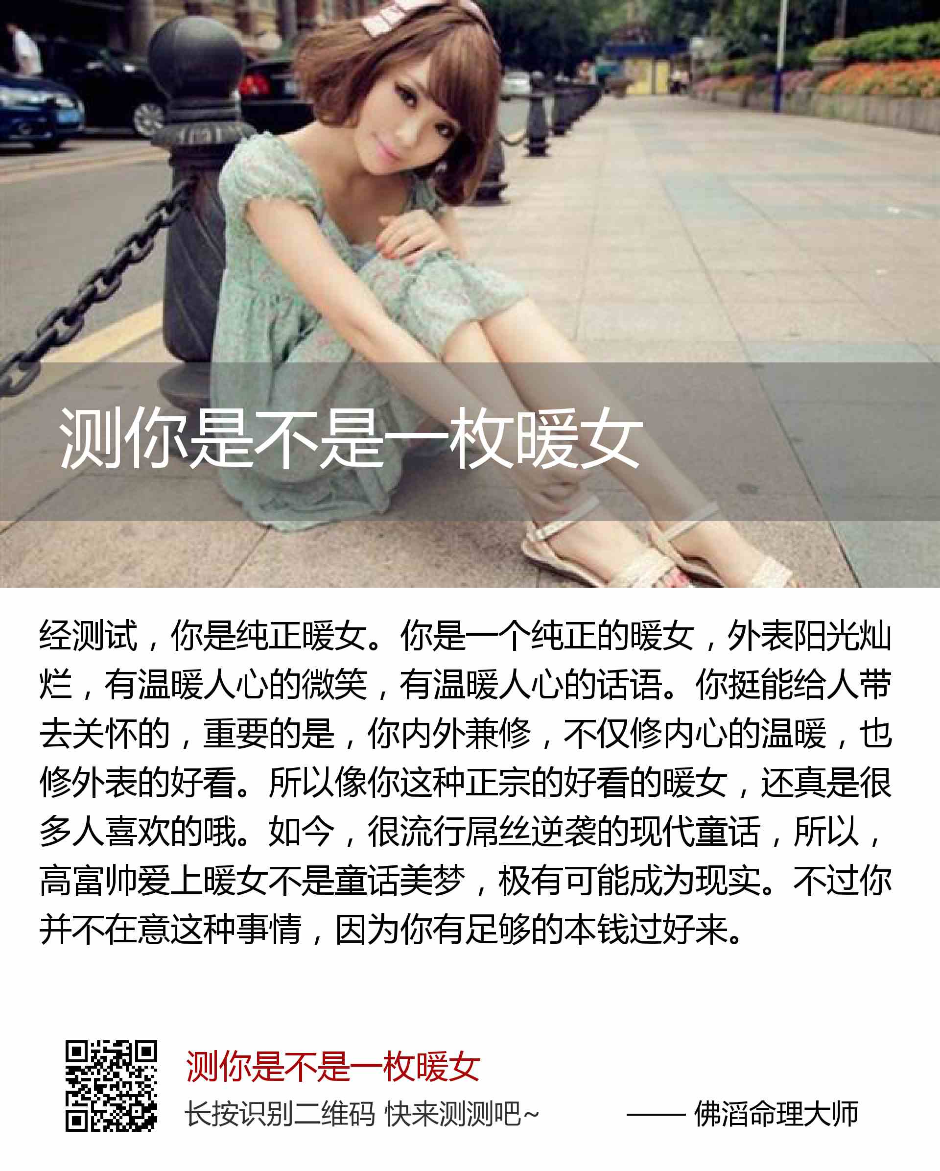 你是一个纯正的暖女,外表阳光灿烂,有温暖人心的微笑,有温暖人心的话语。你挺能给人带去关怀的,重要的是,你内外兼修,不仅修内心的温暖,也修外表的好看。所以像你这种正宗的好看的暖女,还真是很多人喜欢的哦。如今,很流行屌丝逆袭的现代童话,所以,高富帅爱上暖女不是童话美梦,极有可能成为现实。不过你并不在意这种事情,因为你有足够的本钱过好来。