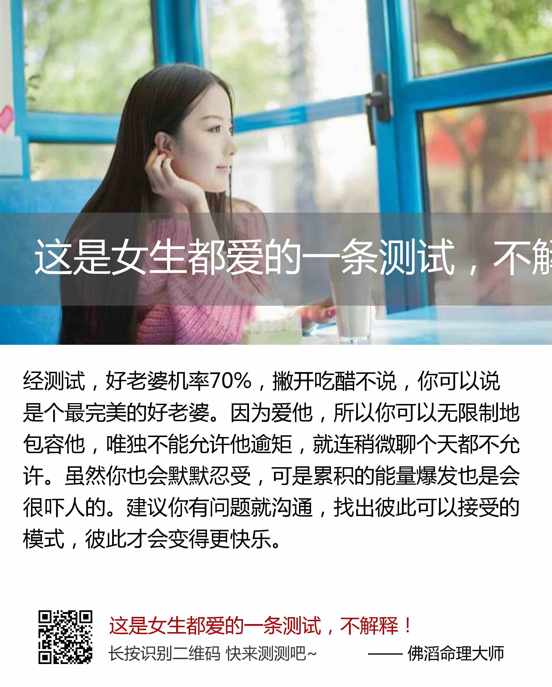 好老婆机率70%,撇开吃醋不说,你可以说是个最完美的好老婆。
