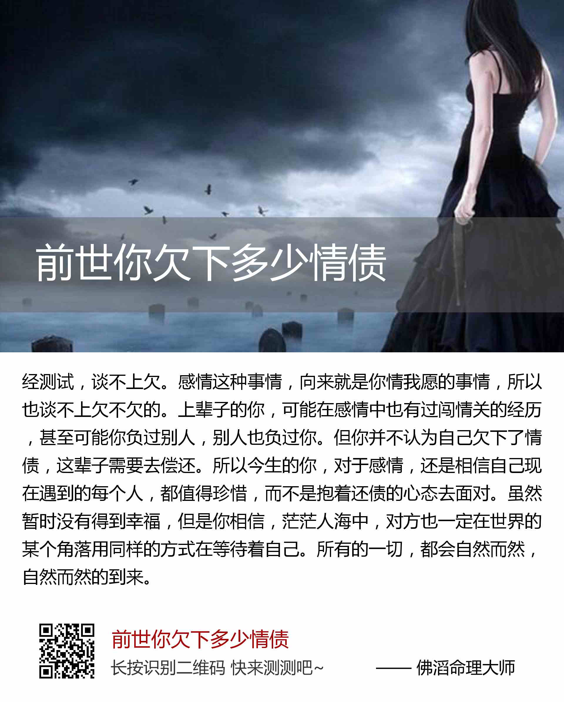 感情这种事情,向来就是你情我愿的事情,所以也谈不上欠不欠的。上辈子的你,可能在感情中也有过闯情关的经历,甚至可能你负过别人,别人也负过你。但你并不认为自己欠下了情债,这辈子需要去偿还。所以今生的你,对于感情,还是相信自己现在遇到的每个人,都值得珍惜,而不是抱着还债的心态去面对。虽然暂时没有得到幸福,但是你相信,茫茫人海中,对方也一定在世界的某个角落用同样的方式在等待着自己。所有的一切,都会自然而然,自然而然的到来。