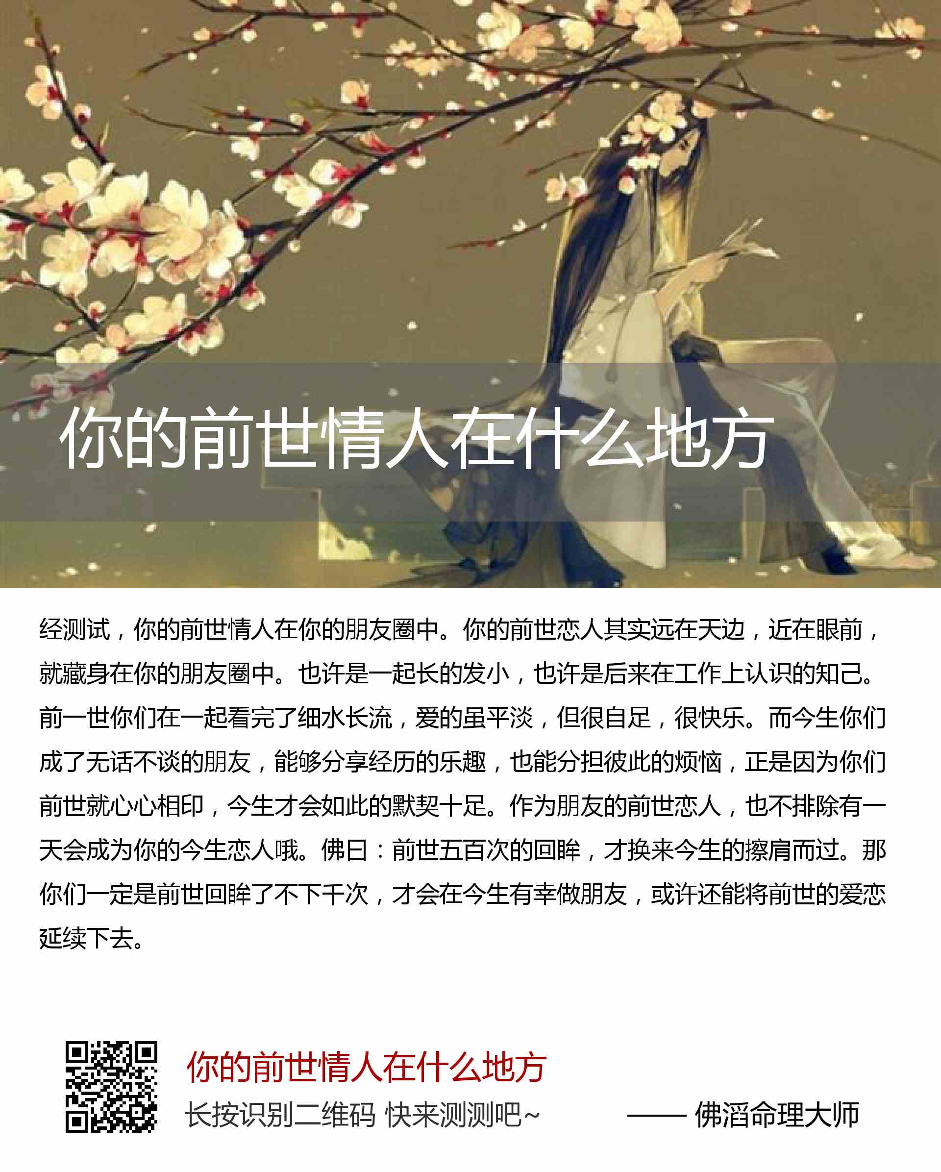 你的前世恋人其实远在天边,近在眼前,就藏身在你的朋友圈中。也许是一起长的发小,也许是后来在工作上认识的知己。前一世你们在一起看完了细水长流,爱的虽平淡,但很自足,很快乐。而今生你们成了无话不谈的朋友,能够分享经历的乐趣,也能分担彼此的烦恼,正是因为你们前世就心心相印,今生才会如此的默契十足。作为朋友的前世恋人,也不排除有一天会成为你的今生恋人哦。佛曰:前世五百次的回眸,才换来今生的擦肩而过。那你们一定是前世回眸了不下千次,才会在今生有幸做朋友,或许还能将前世的爱恋延续下去。