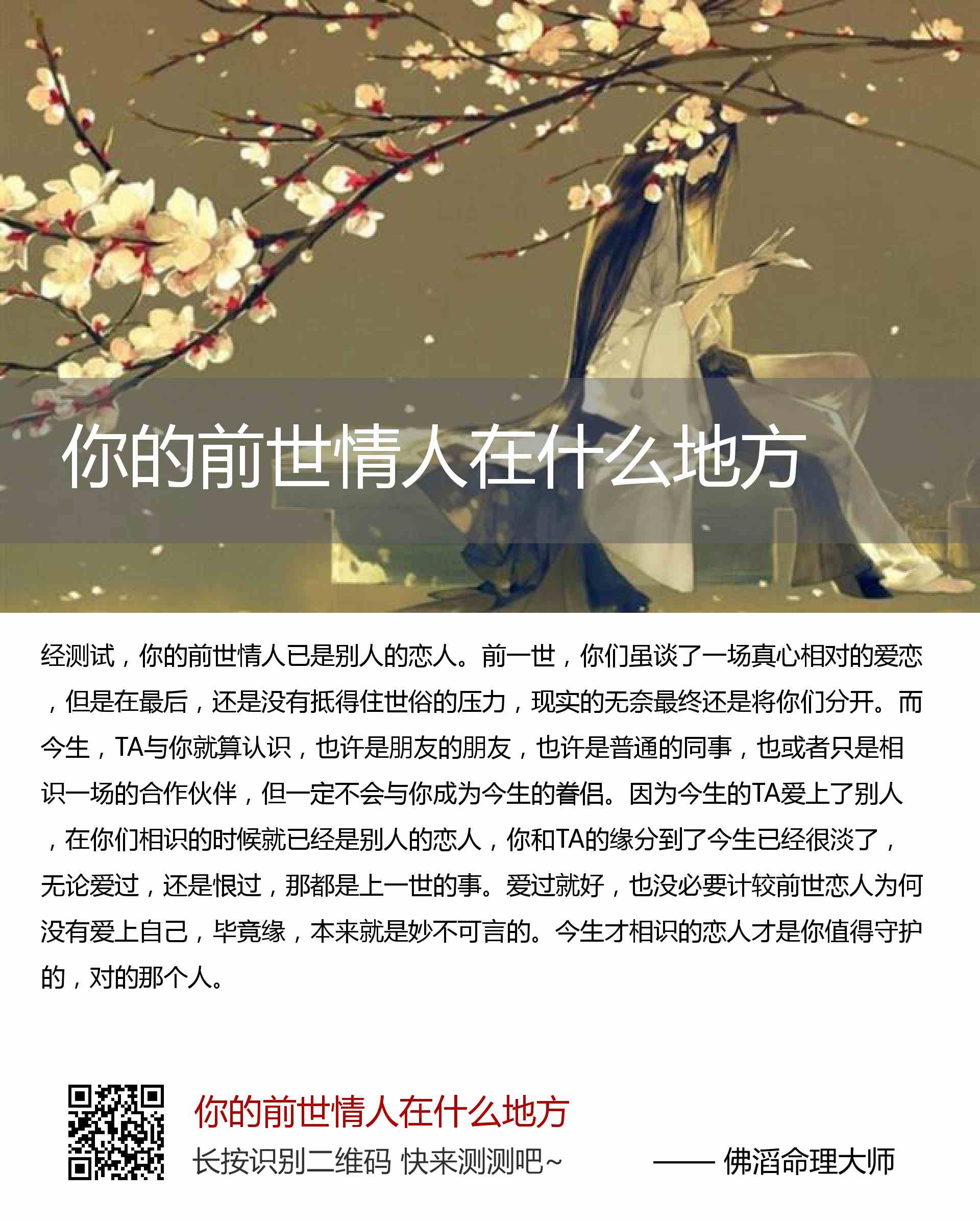 前一世,你们虽谈了一场真心相对的爱恋,但是在最后,还是没有抵得住世俗的压力,现实的无奈最终还是将你们分开。而今生,TA与你就算认识,也许是朋友的朋友,也许是普通的同事,也或者只是相识一场的合作伙伴,但一定不会与你成为今生的眷侣。因为今生的TA爱上了别人,在你们相识的时候就已经是别人的恋人,你和TA的缘分到了今生已经很淡了,无论爱过,还是恨过,那都是上一世的事。爱过就好,也没必要计较前世恋人为何没有爱上自己,毕竟缘,本来就是妙不可言的。今生才相识的恋人才是你值得守护的,对的那个人。