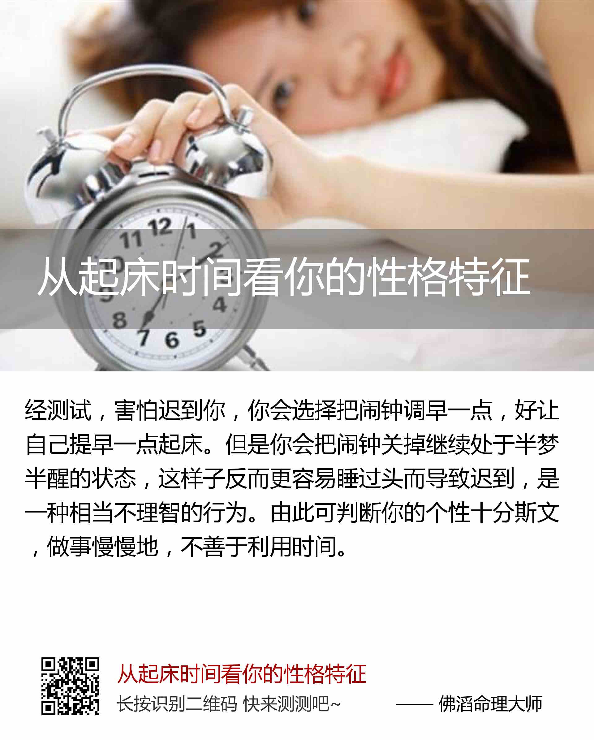 但是你会把闹钟关掉继续处于半梦半醒的状态,这样子反而更容易睡过头而导致迟到,是一种相当不理智的行为。由此可判断你的个性十分斯文,做事慢慢地,不善于利用时间。