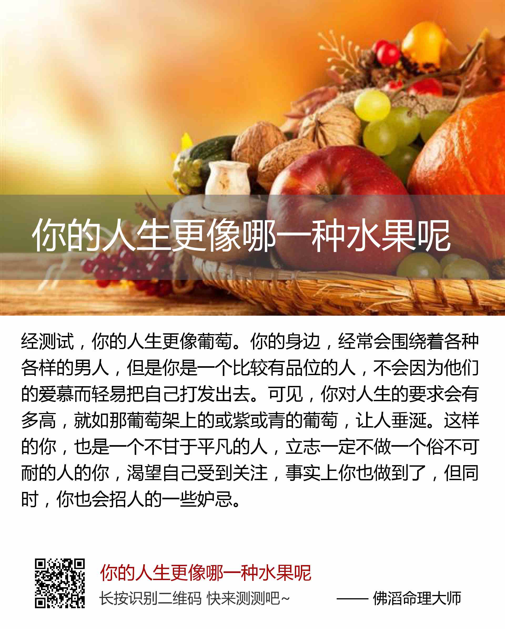 你的身边,经常会围绕着各种各样的男人,但是你是一个比较有品位的人,不会因为他们的爱慕而轻易把自己打发出去。可见,你对人生的要求会有多高,就如那葡萄架上的或紫或青的葡萄,让人垂涎。这样的你,也是一个不甘于平凡的人,立志一定不做一个俗不可耐的人的你,渴望自己受到关注,事实上你也做到了,但同时,你也会招人的一些妒忌。