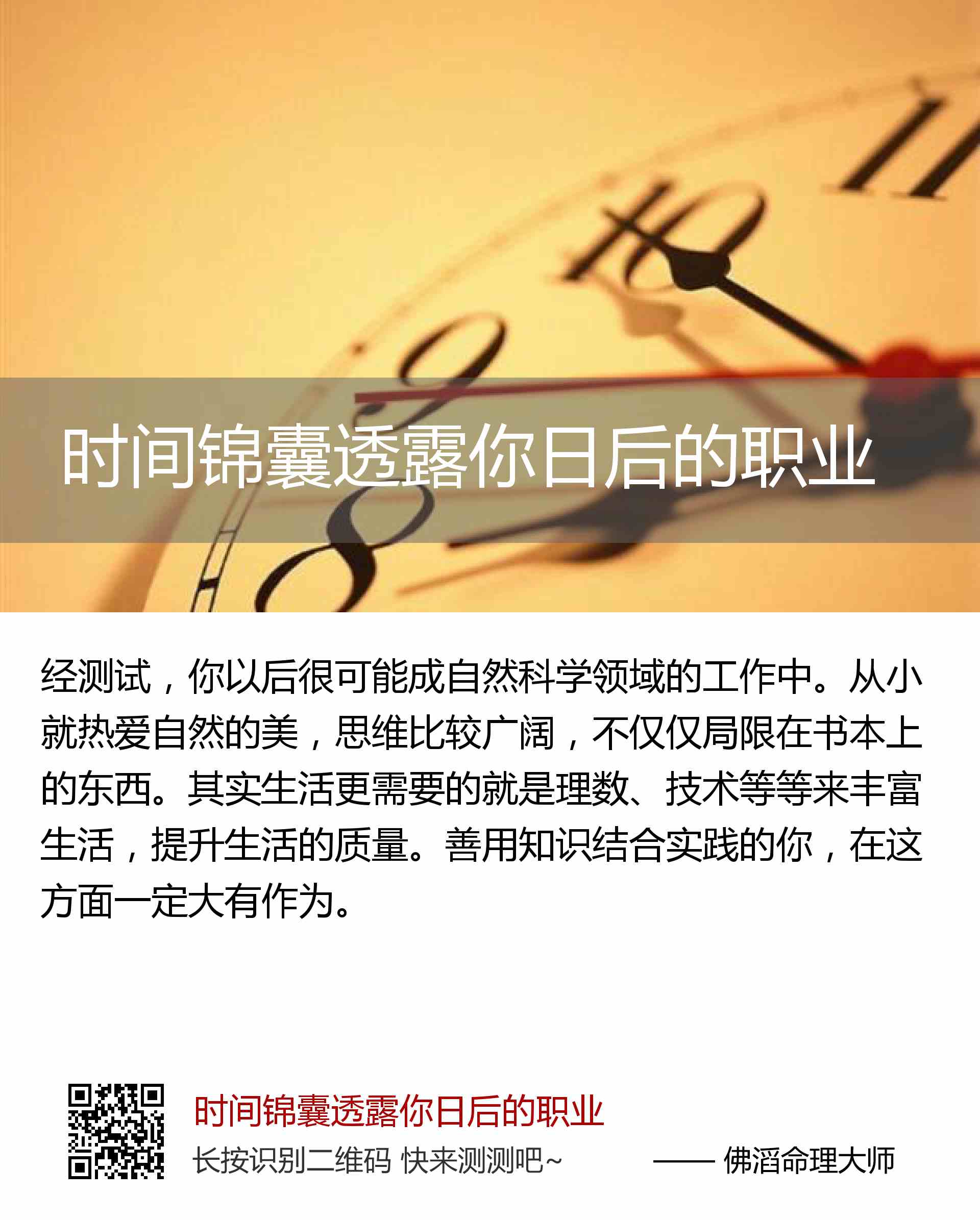 从小就热爱自然的美,思维比较广阔,不仅仅局限在书本上的东西。其实生活更需要的就是理数、技术等等来丰富生活,提升生活的质量。善用知识结合实践的你,在这方面一定大有作为。