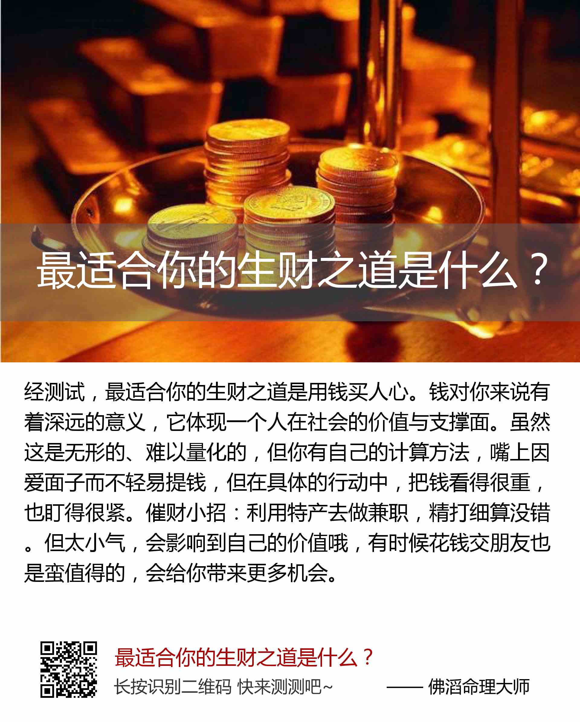 钱对你来说有着深远的意义,它体现一个人在社会的价值与支撑面。虽然这是无形的、难以量化的,但你有自己的计算方法,嘴上因爱面子而不轻易提钱,但在具体的行动中,把钱看得很重,也盯得很紧。催财小招:利用特产去做兼职,精打细算没错。但太小气,会影响到自己的价值哦,有时候花钱交朋友也是蛮值得的,会给你带来更多机会。