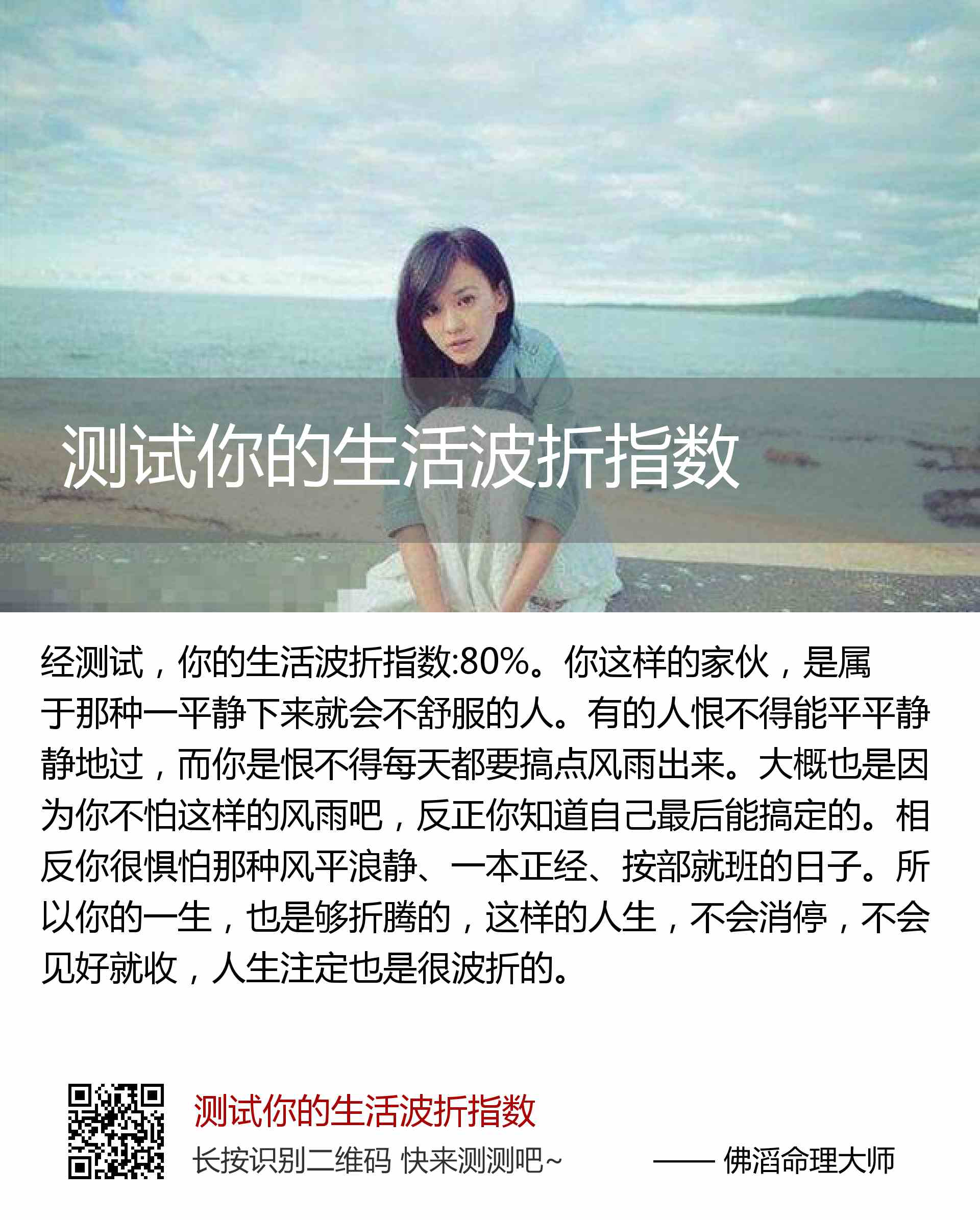 你这样的家伙,是属于那种一平静下来就会不舒服的人。有的人恨不得能平平静静地过,而你是恨不得每天都要搞点风雨出来。大概也是因为你不怕这样的风雨吧,反正你知道自己最后能搞定的。相反你很惧怕那种风平浪静、一本正经、按部就班的日子。所以你的一生,也是够折腾的,这样的人生,不会消停,不会见好就收,人生注定也是很波折的。