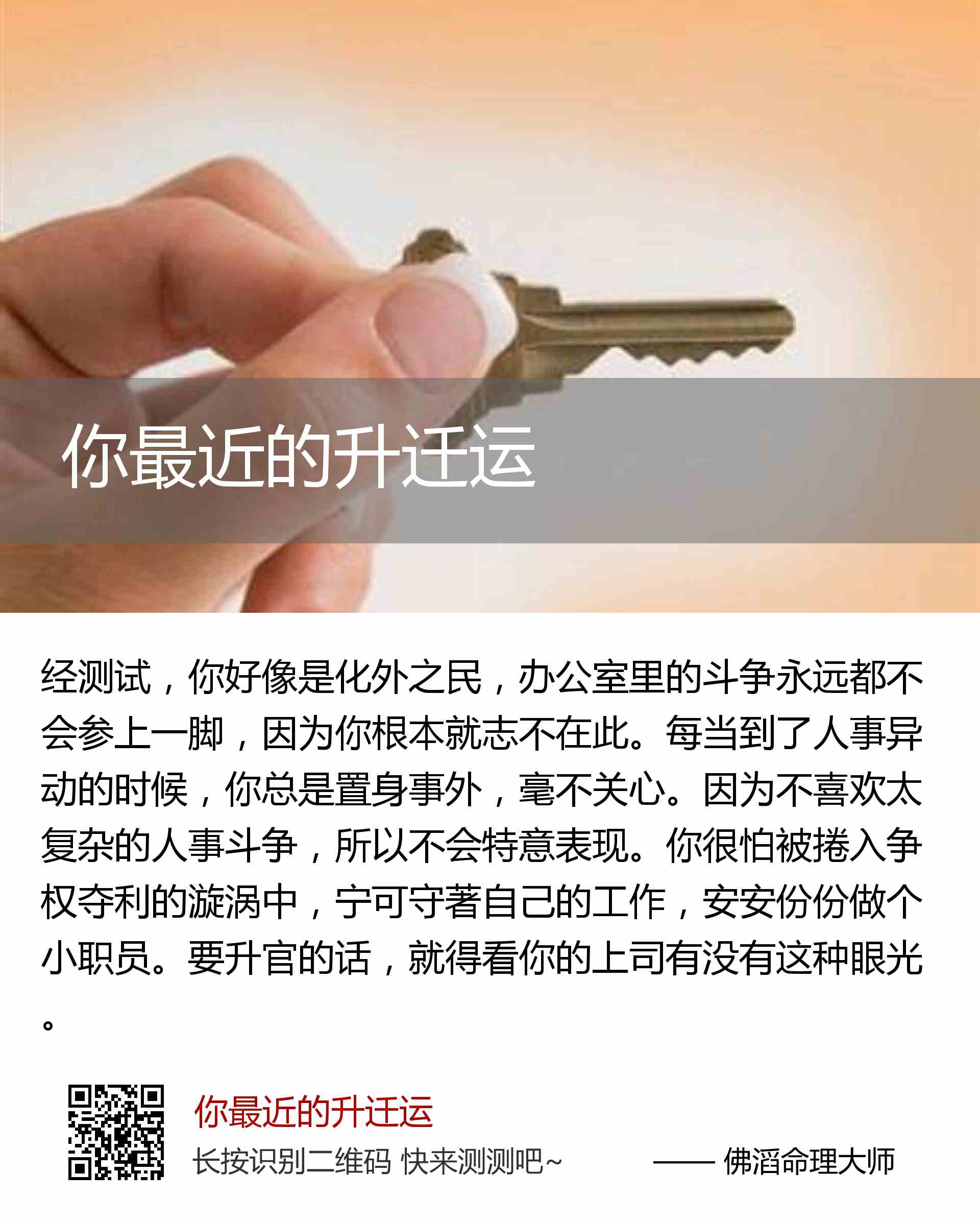 每当到了人事异动的时候,你总是置身事外,毫不关心。因为不喜欢太复杂的人事斗争,所以不会特意表现。你很怕被捲入争权夺利的漩涡中,宁可守著自己的工作,安安份份做个小职员。要升官的话,就得看你的上司有没有这种眼光。