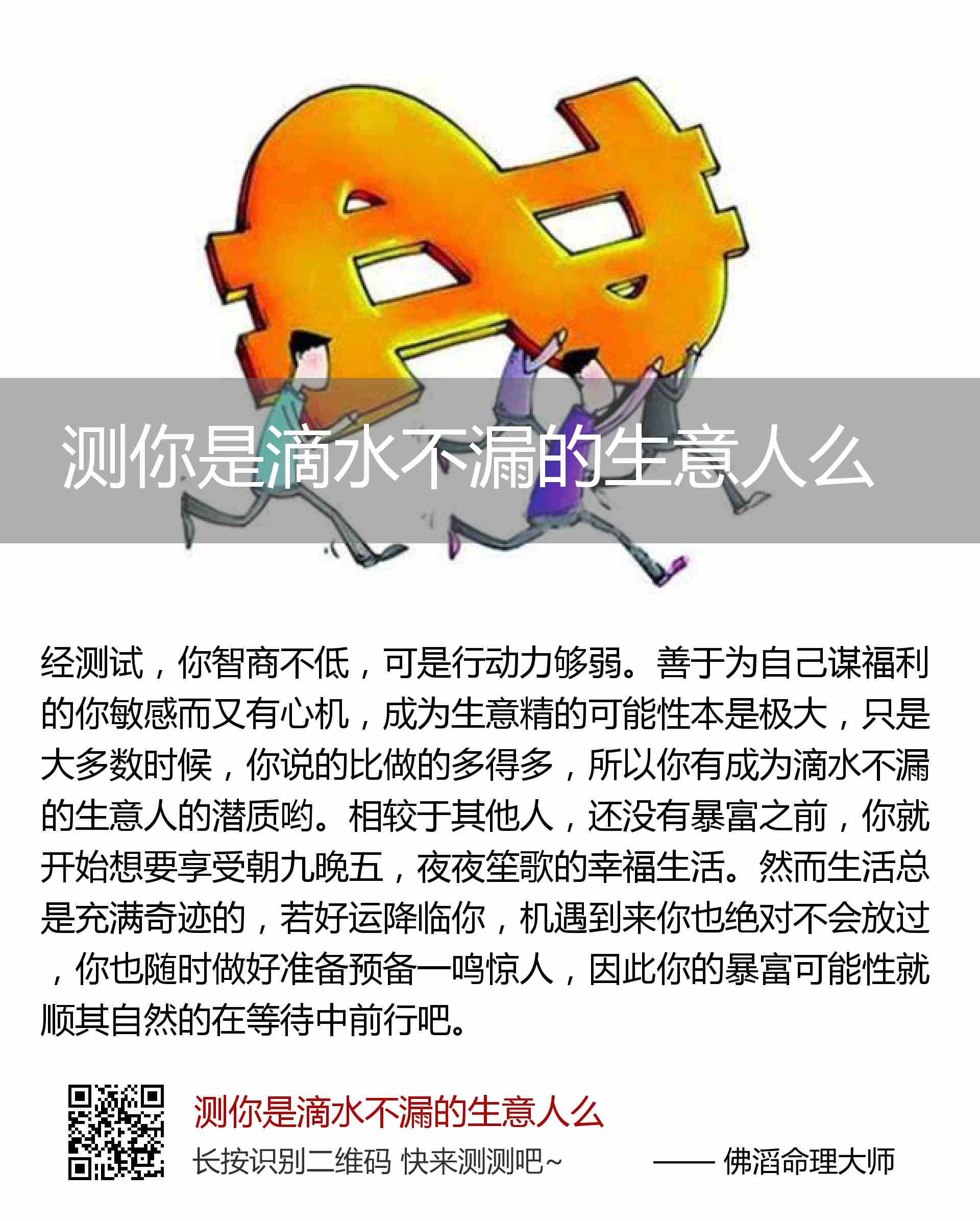 善于为自己谋福利的你敏感而又有心机,成为生意精的可能性本是极大,只是大多数时候,你说的比做的多得多,所以你有成为滴水不漏的生意人的潜质哟。相较于其他人,还没有暴富之前,你就开始想要享受朝九晚五,夜夜笙歌的幸福生活。然而生活总是充满奇迹的,若好运降临你,机遇到来你也绝对不会放过,你也随时做好准备预备一鸣惊人,因此你的暴富可能性就顺其自然的在等待中前行吧。