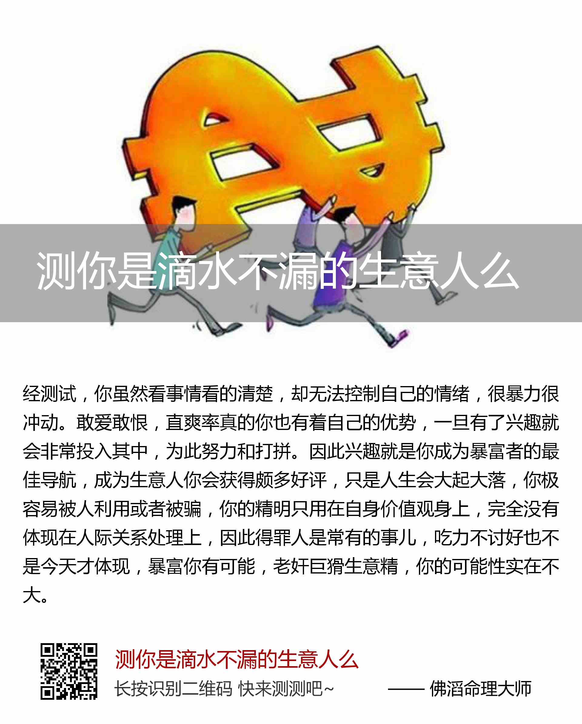 敢爱敢恨,直爽率真的你也有着自己的优势,一旦有了兴趣就会非常投入其中,为此努力和打拼。因此兴趣就是你成为暴富者的最佳导航,成为生意人你会获得颇多好评,只是人生会大起大落,你极容易被人利用或者被骗,你的精明只用在自身价值观身上,完全没有体现在人际关系处理上,因此得罪人是常有的事儿,吃力不讨好也不是今天才体现,暴富你有可能,老奸巨猾生意精,你的可能性实在不大。