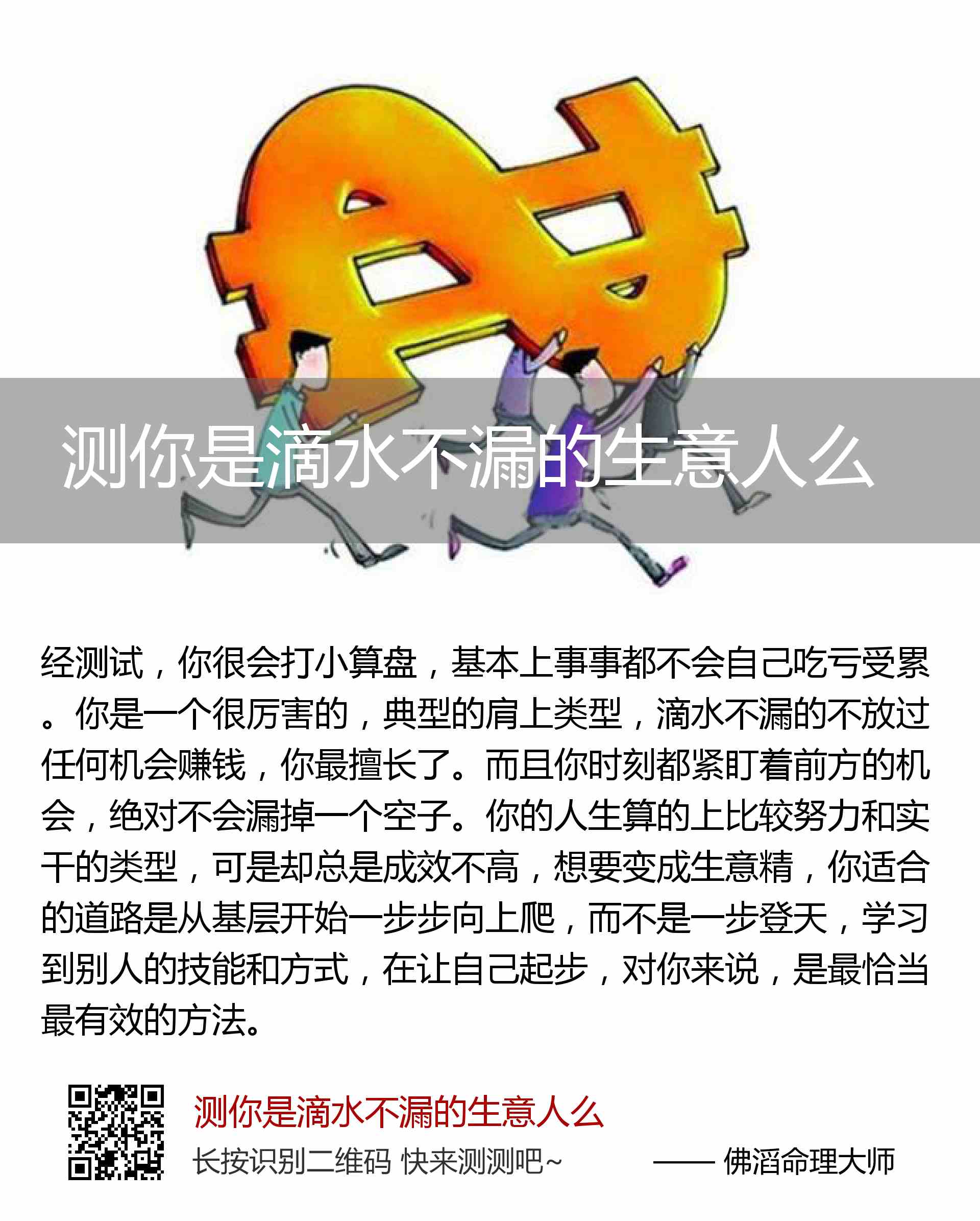 你是一个很厉害的,典型的肩上类型,滴水不漏的不放过任何机会赚钱,你最擅长了。而且你时刻都紧盯着前方的机会,绝对不会漏掉一个空子。你的人生算的上比较努力和实干的类型,可是却总是成效不高,想要变成生意精,你适合的道路是从基层开始一步步向上爬,而不是一步登天,学习到别人的技能和方式,在让自己起步,对你来说,是最恰当最有效的方法。